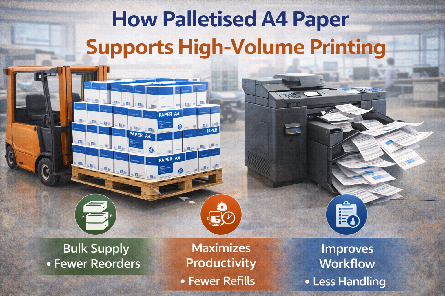 Palletised A4 paper supports high-volume printing by offering cost savings, consistent quality, and operational efficiency. For businesses that rely on continuous printing, bulk paper supply reduces downtime, simplifies procurement, and keeps workflows running smoothly.