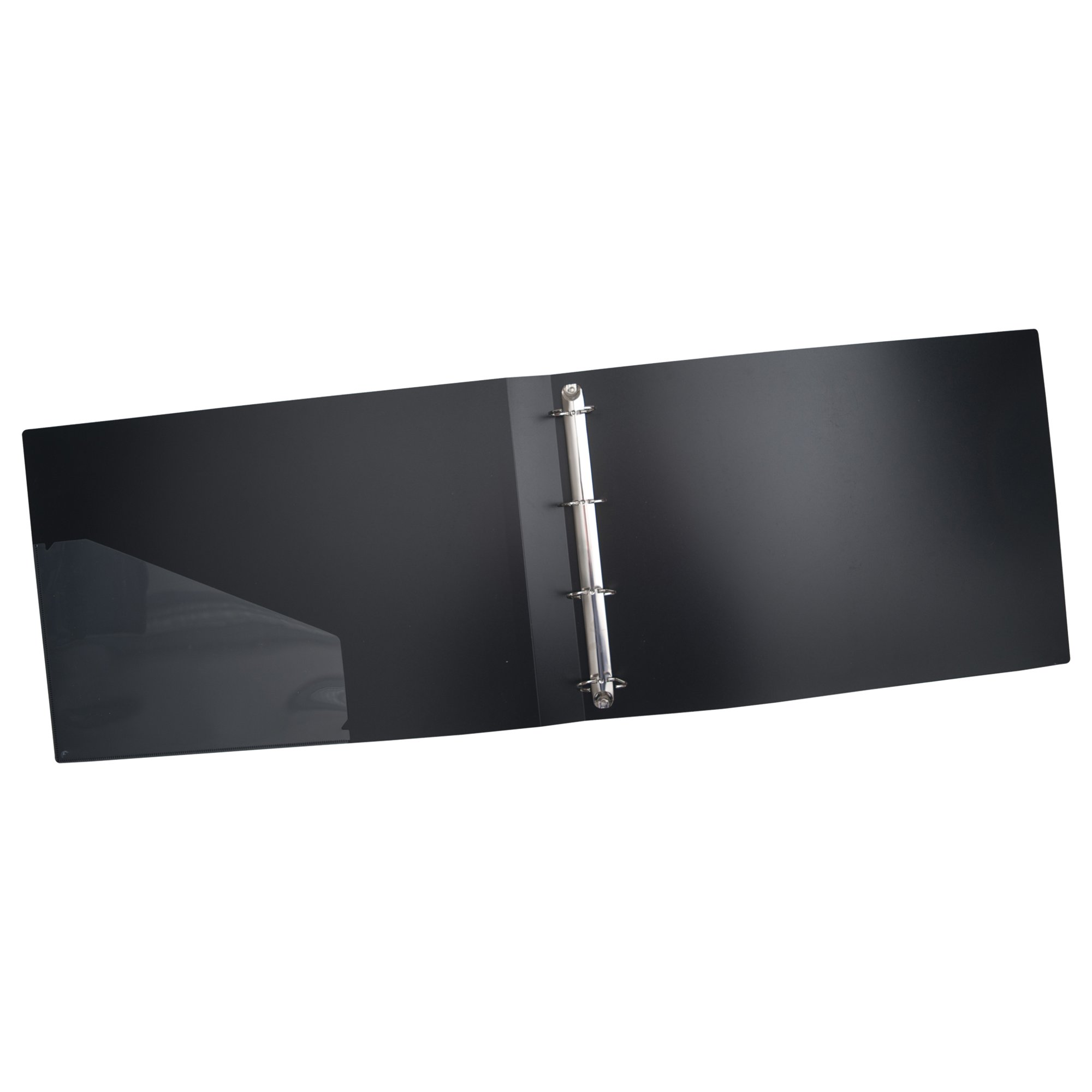 Strong black 1000 micron landscape cover ring binder with clear 160 micron A3 size sleeve on front cover and spine cover for personalisation and presentation. Clear additional storage pocket featured inside of front cover to house loose items and documents. 4 ”D” ring mechanism securely hold A3 punched pockets or paper. Ring capacity 25mm with a 40mm spine. Responsibly sourced materials and responsibly produced. Made from 95% recycled materials, product 100% recyclable.