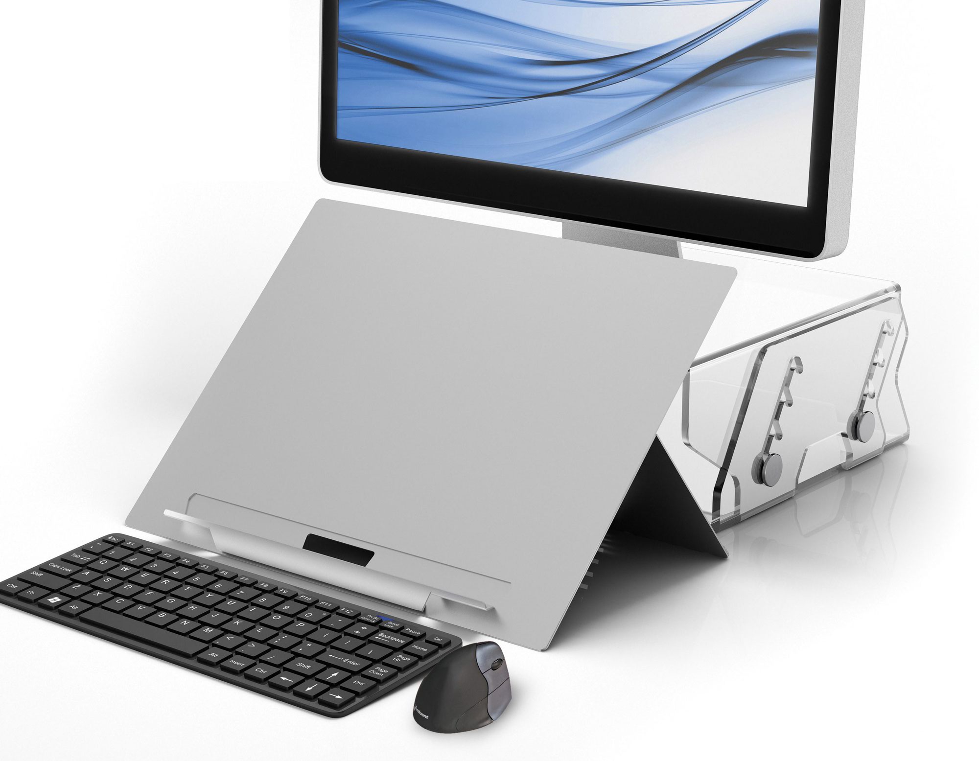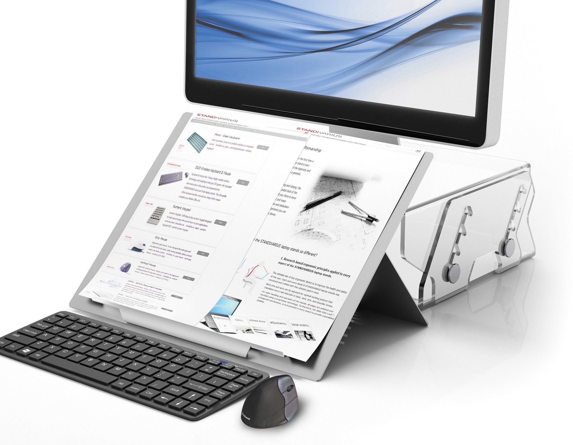 The standivarius Libro H is a portable A3 fold-away document and book holder. It has been designed to provide a correct in-line working position to relieve back / neck pain. It can be used to hold single documents, A4 spreads, open books, A3 sheets of paper or just tablets, what ever you need for your work. With 5 height adjustment possibilities it matches all height and opening angle requirements. It is also an excellent space-saver as it has a smaller footprint and it folds flat to just 2.5 mm – a good ergonomic companion for small desks.