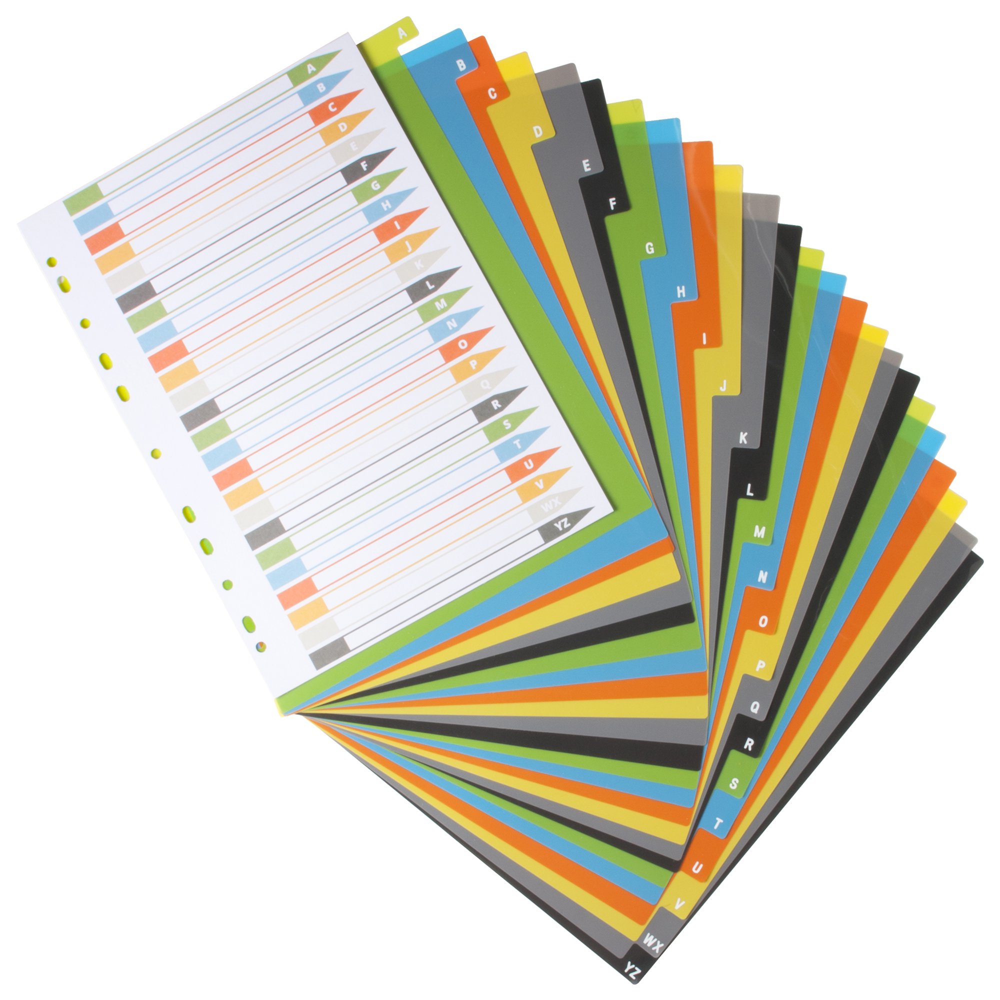 Strong 200 micron strength A4 size index file dividers, ideal for home, office and professional use. Set of 24 dividers colour coded and labelled A to Z for the filing and organising of paperwork and documents in ring binders and files. Includes a contents page for easy referencing, templates can be downloaded from our website. Extra wide for use with multi-punched pockets. Responsibly sourced materials and responsibly produced. Made from 50% recycled materials, product and packaging both 100% recyclable.