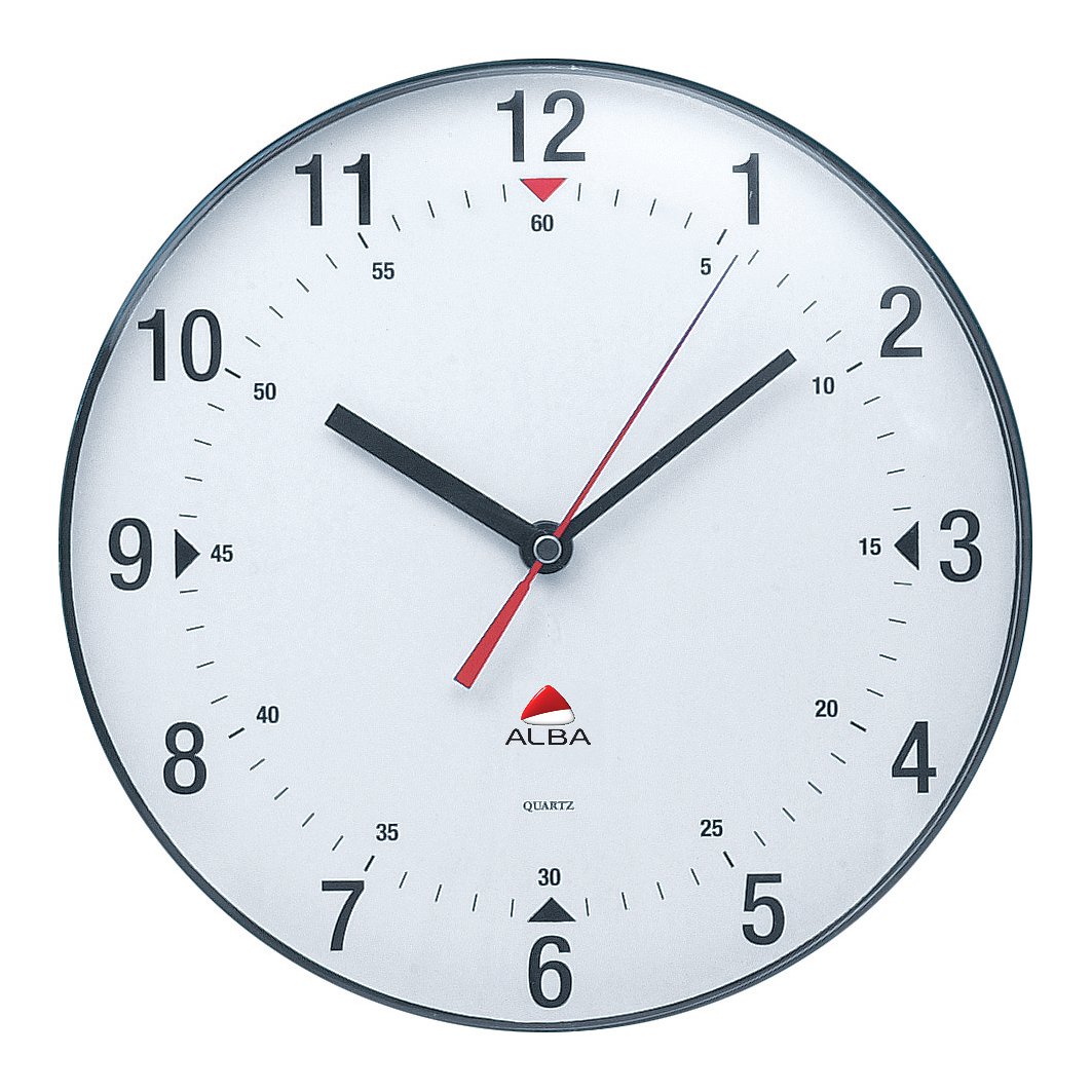 A classic design with a plastic lens and case. Quartz movement. Shows hours and minutes. Requires AA battery (not included). Diameter: 250mm.