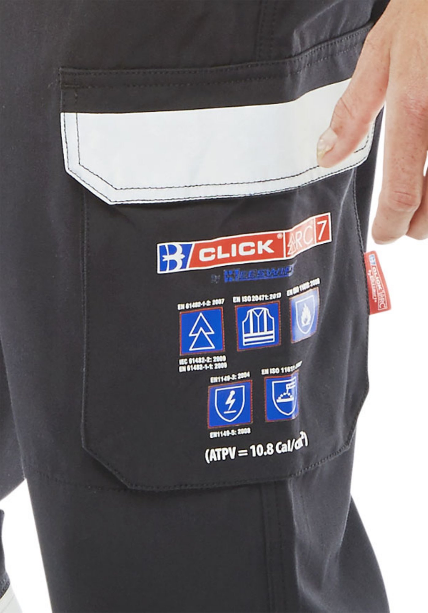 Fire Retardant, Hi Vis, Anti-static, ARC Flash coverall. 300gsm 60/40 Modacrylic/cotton blend. Triple stitch construction. 2 hip pockets. Large bellows pocket to each leg with hook and loop closure flap. Right leg mobile phone pocket with hook and loop closure flap. All pocket flaps with Retro-reflective tape feature. Internal knee pad pouches. Large qualifying icons on left leg pocket. EN ISO 13688:2013 – General requirements for protective clothing, EN ISO 20471:2013 Class 3 – Test method for high visibility, EN 1149-3:2004 – Anti Static – Test methods for measurements of charge decay, EN 1149-5:2008 – Anti Static – Material performance and design requirements, EN ISO 11611:2015 (Class 1 A1 A2) – Protective clothing for use in welding, EN ISO 11612:2015 (A1 A2 B1 C1) – Protection against heat and flame ARC FLASH IEC 61482-2:2009 – Performance requirements and design requirements EN 61482-1-2:2007 (Class 1 = 4kA) – Box Arc testing EN 61482-1-1:2009 (ATPV = 10.8 Cal/cm2) – Open Arc testing, Each garment style is independently tested to both box and open ARC standards. Click ARC production is covered by article 11B certification.