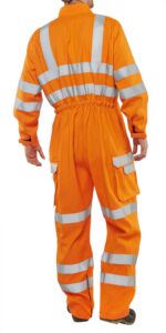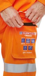 Fire Retardant, Hi Vis, Anti-static, ARC Flash Orange Coverall. GO/RT 3279 issue 8 2013 for use on or around railway lines. 310gsm 40% Modacrylic 24% Viscose, 20% Polyester, 10% Cotton, 4% Aramid, 2% Anti-static Fibre. 2 hip pockets. Large bellows pocket to each leg with hook and loop closure flap. Right leg mobile phone pocket with hook and loop closure flap. All pocket flaps with Retro-reflective tape feature. Internal knee pad pouches. Large qualifying icons on left leg pocket. Adjustable leg bellows. EN ISO 13688:2013 – General requirements for protective clothing, EN ISO 20471:2013 Class 3 – Test method for high visibility – GORT 3279 Issue 8, EN 1149-3:2004 – Anti Static – Test methods for measurements of charge decay, EN 1149-5:2008 – Anti Static – Material performance and design requirements, EN ISO 11611:2015 (Class 1 A1 A2) – Protective clothing for use in welding, EN ISO 11612:2015 (A1 A2 B1 C1) – Protection against heat and flame ARC FLASH IEC 61482-2:2009 – Performance requirements and design requirements EN 61482-1-2:2007 (Class 1 = 4kA) – Box Arc testing EN 61482-1-1:2009 (ATPV = 16 Cal/cm2) – Open Arc testing, Each garment style is independantly tested to both box and open ARC standards. Click ARC production is covered by article 11B certification.