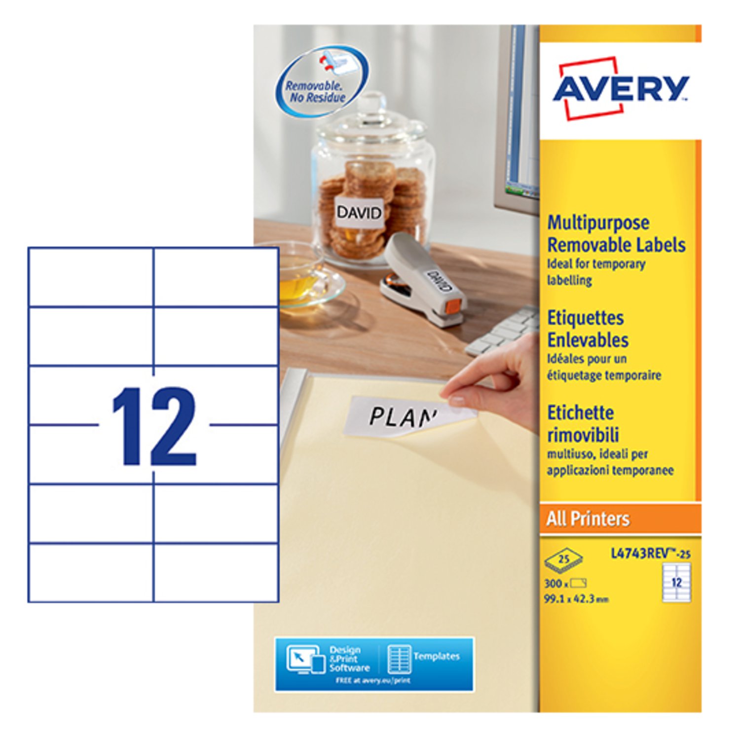 Avery Multipurpose Mini Removable Label 99×42.3mm 12 Per A4 Sheet White (Pack 300 Labels) L4743REV-25