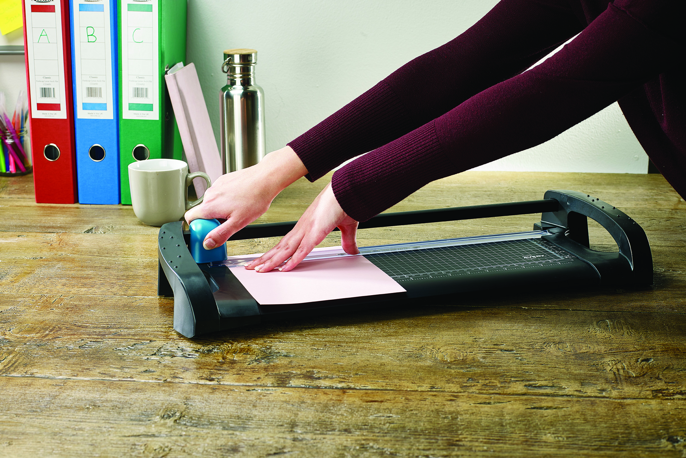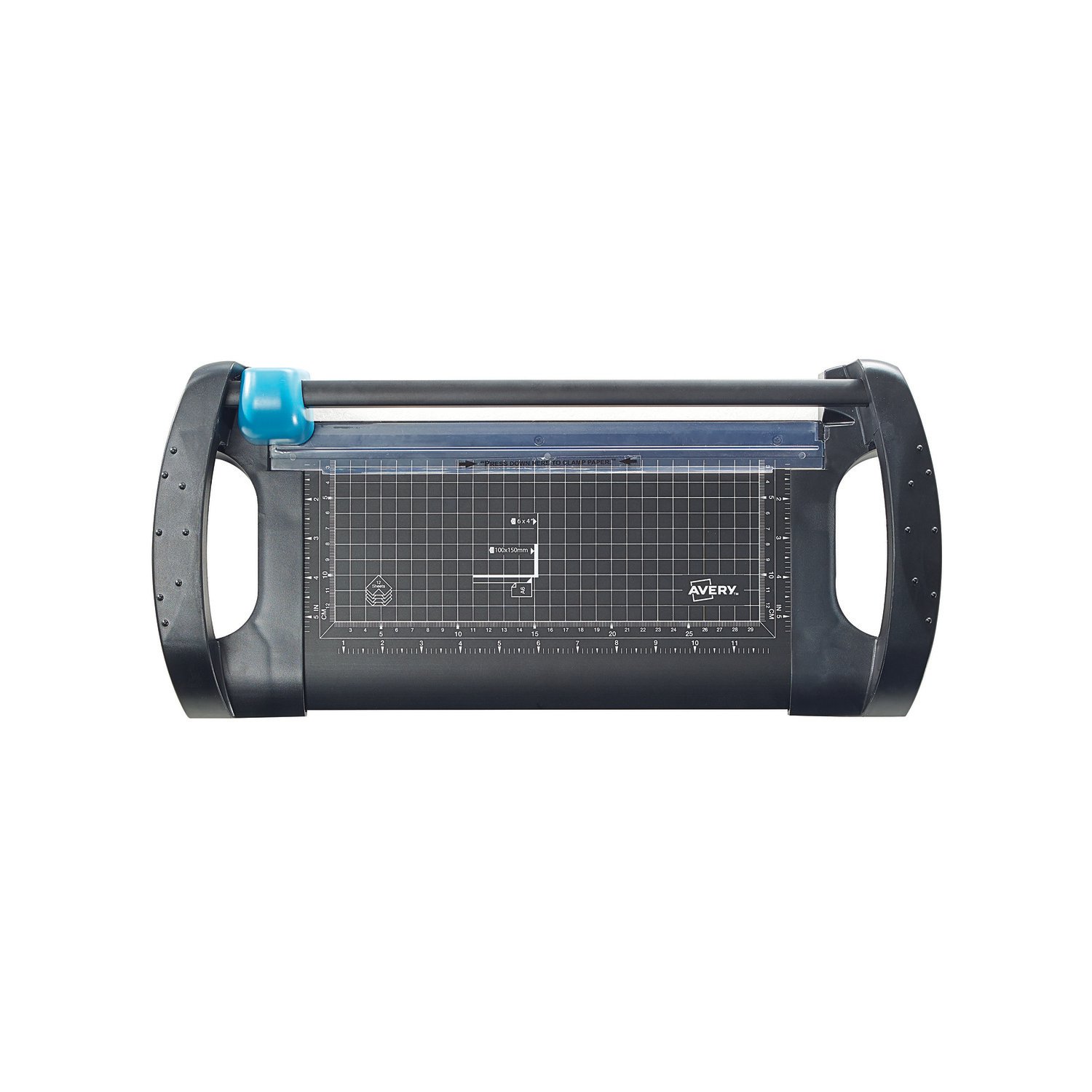 The Avery Office A4 Paper Trimmer is lightweight but strong and sturdy and cuts through 12 sheets of 80gsm paper at a time with no difficulty, ideal for everyday cutting in the office and home. It’s easy to store either flat or upright, with handles for safe portability. The stylish design in black and teal colours works well in any environment and with its clear baseboard markings for paper and photo sizes, imperial and metric measurements makes cutting more precise. The blade is self-sharpening too and is enclosed in a comfy ergonomic cutter head, nice to hold and smooth to cut. Our trimmer comes with a 5 year guarantee with replacement spares for this time too. It has the TUV GS and BS marks, which ensures it is manufactured to the highest quality and safety standards.