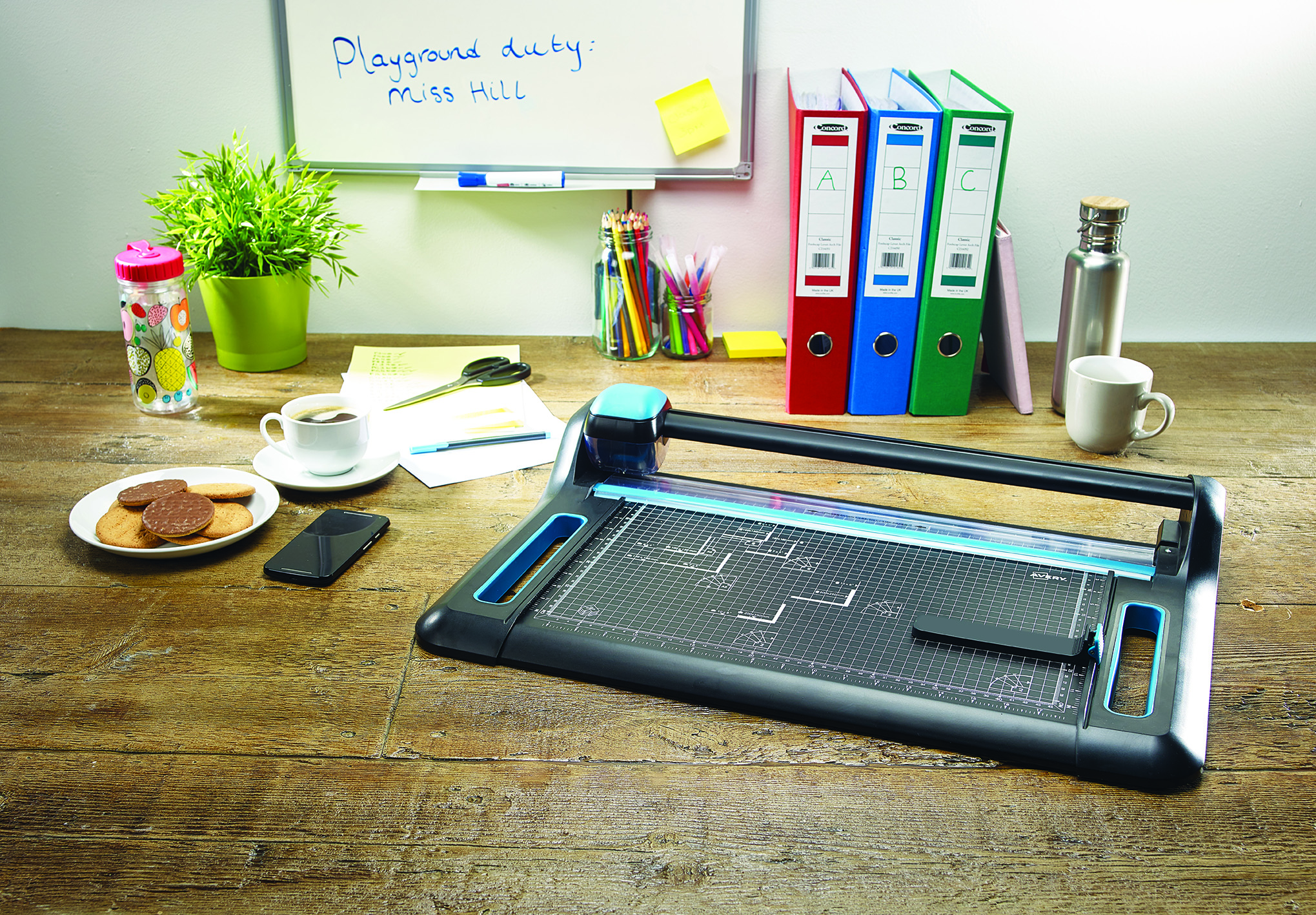 The design with its sleek rounded corners and attractive black and teal colours fits well in any surroundings. The extra features on this trimmer include a 65mm self-sharpening blade, see-through cutterhead window for visibility of the blade making cutting more accurate, a clippings tray and a magnetic backstop for precise repeat cutting.