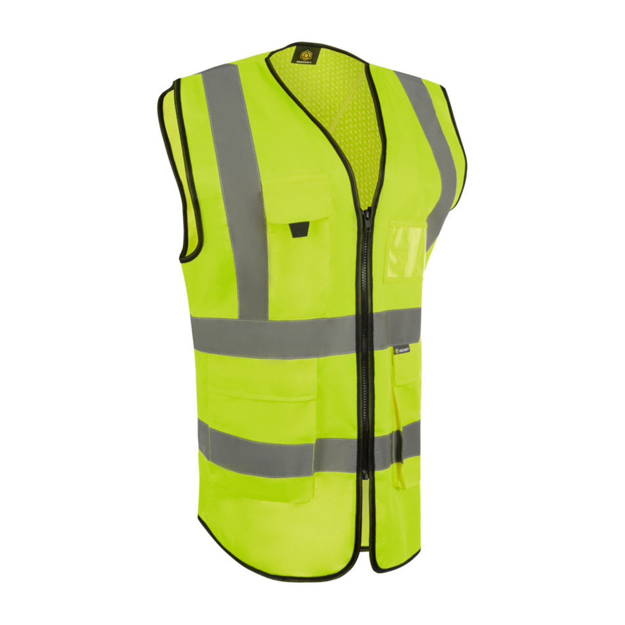 100% Polyester Front zip fastening Two large front pockets with flaps Mobile phone pocket with hook and loop fastening flap Radio loop Pen & pencil pockets Transparent ID pouch pocket Retro-reflective tape Covered mesh back panel Conforms to EN ISO 13688:2013+A1:2021 Conforms to EN ISO 20471:2013+A1:2016 Class 1 High Visibility