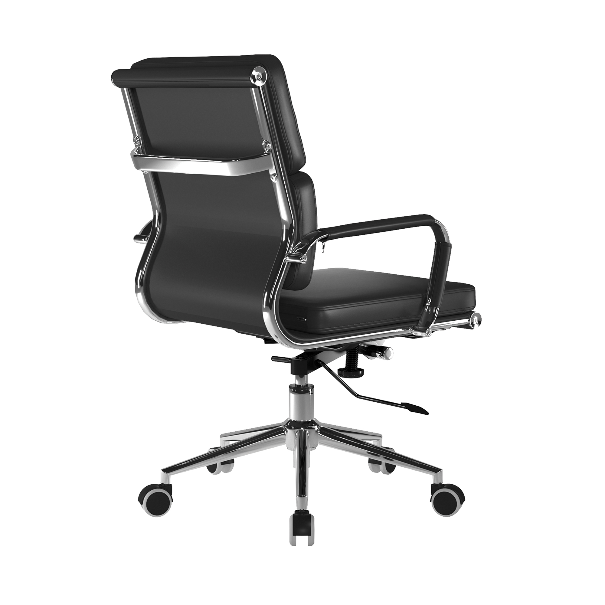 This medium back designer executive chair is upholstered in plush bonded leather and is suitable for both a workplace or home office environment. Offering detailed stitching with a bold twin panel back cushion design, a strong single piece chrome frame with complementing integral chrome arms with bonded leather sleeves, it has a gaslift for easy seat height adjustment, and a mechanism which allows the user to fully recline in the chair and is adjustable for individual – bodyweight (tension control) which can be locked in the upright position. It is finished with a polished chrome spider base with twin wheel hooded castors.