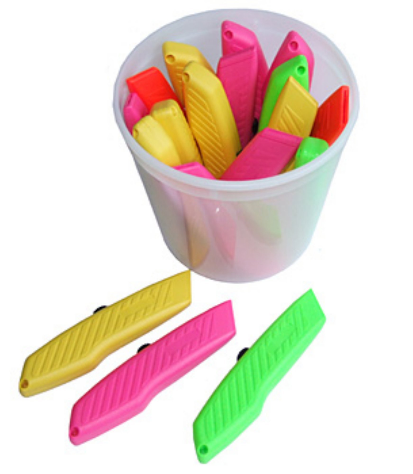 – A sealed tub of 18 multicoloured high visibility retractable utility knives – Neon utility knives – Plastic – Disposable