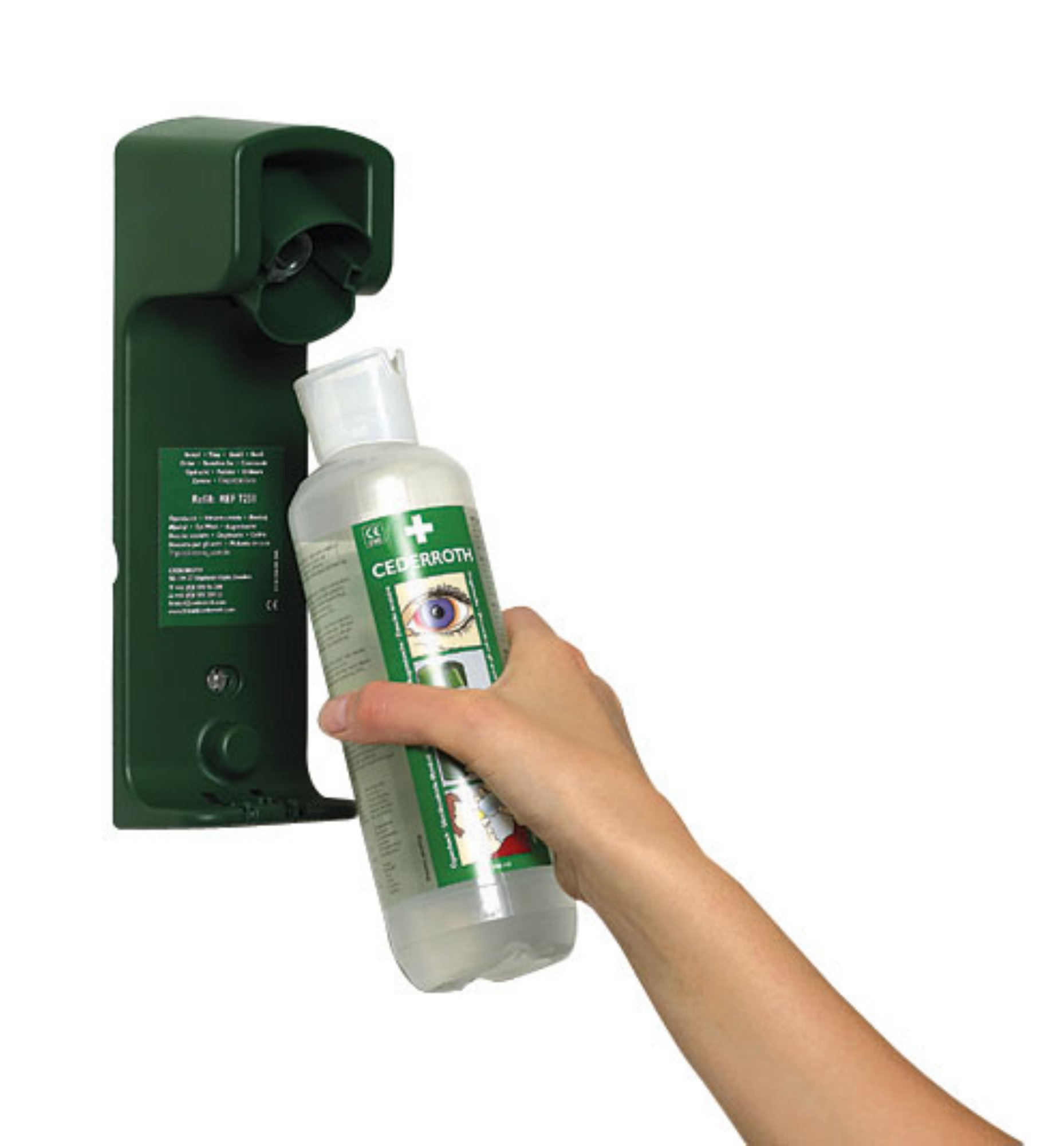 – The wall bracket for the 500ml Cederroth eyewash opens the bottle automatically when the bottle is rotated and released from the eyewash stand. Can be used singularly or in a bank of several units