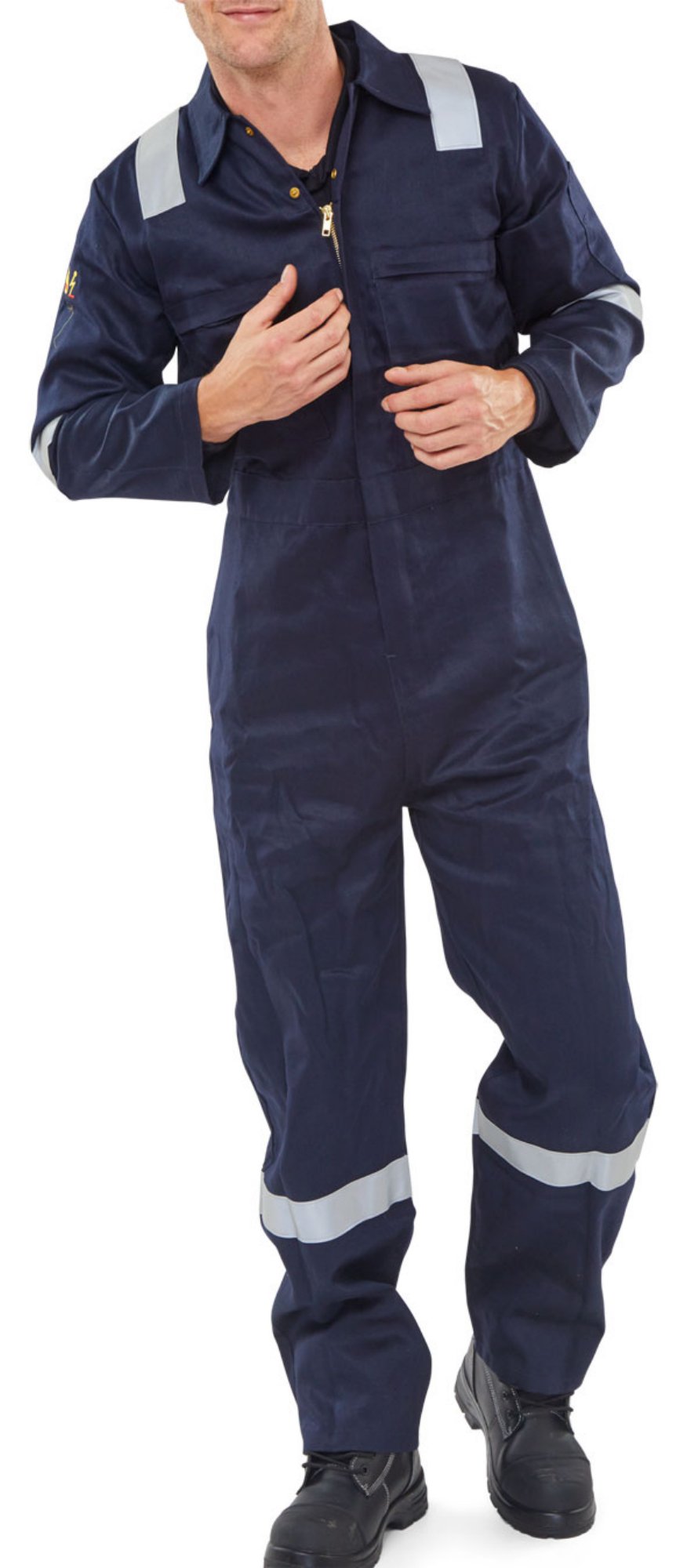 220 gram 99% Cotton, 1% Anti-static fibre, Flame retardant/Anti static, FR retro-reflective tape. (Nordic Design), Concealed zip front to neck, Two breast pockets, brass zip closure, Two hip pockets, vertical access, One rear hip patch pocket with flap, One plain patch hip pocket, Rule pocket, Half elasticated waist, Plain cuffs and ankles, ISO 11611: 2007 Class 1 A1 – Protective clothing for use in welding, EN ISO 11612: 2008 A1, B1, C1 – Protection against heat and flame, EN 1149-5: 2008 (EN 1149-3: 2004) – Anti Static – Material performance and design requirements, Does NOT conform to EN ISO 20471