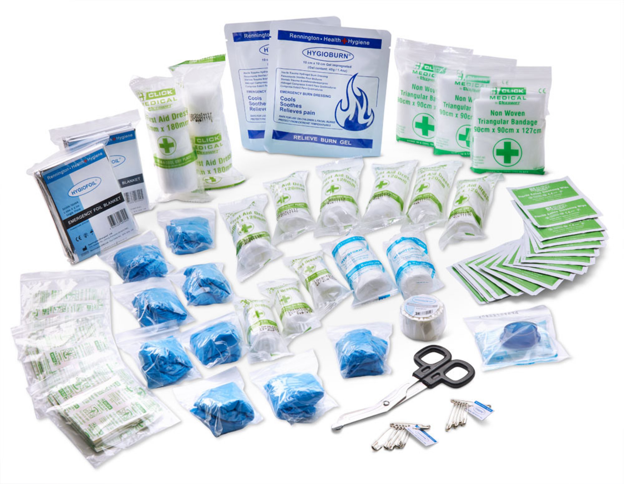 BS8599 Compliant Medium First Aid kit. Kit Contains:, 1 x Guidance note. 2 x Burn relief dressing (10cm x 10cm). 60 x Assorted waterproof plasters. 3 x Eyepad dressing with sterile bandage. 2 x Foil blanket. 2 x Large HSE dressing (18cm x 18cm) sterile Flow-wrapped. 6 x Medium HSE dressing (12cm x 12cm) sterile Flow-wrapped. 9 x Nitrile gloves (pair). 1 x Mouth-to-mouth resuscitation device with valve. 3 x Finger dressing with adhesive fixing 3.5cm. 2 x Conforming bandage 7.5cm x 4m. 1 x Microporous tape 2.5cm x 5m. 30 x Sterile cleansing wipes. 3 x Single use triangular bandage 90cm x 127cm. 1 x Universal shears small.
