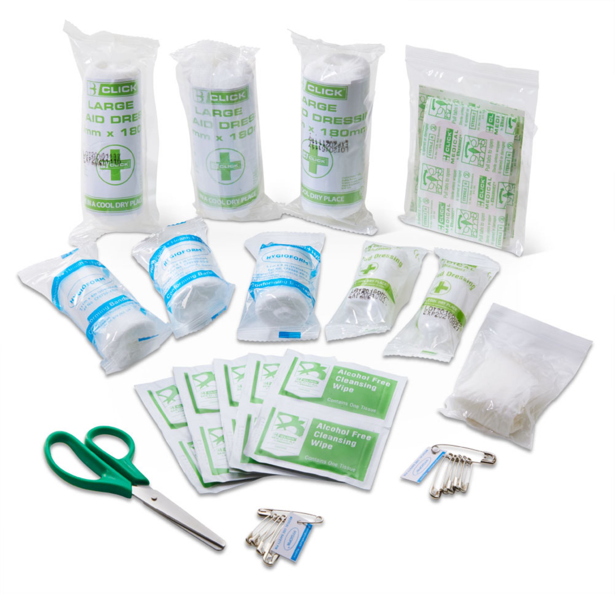 Kit Contains:-, 1 x Guidance note, 2 x Conforming bandage (50 x 45mm), 1 x Conforming bandage (75 x 45mm), 3 x Large sterile dressing (180 x 180mm), 2 x Sterile eye pad dressing, 30 x Assorted sterile waterproof plasters, 10 x Alcohol free cleansing wipes, 1 x Pair of disposable vinyl gloves, 12 x Safety pins, 1 x Tuffcut scissors