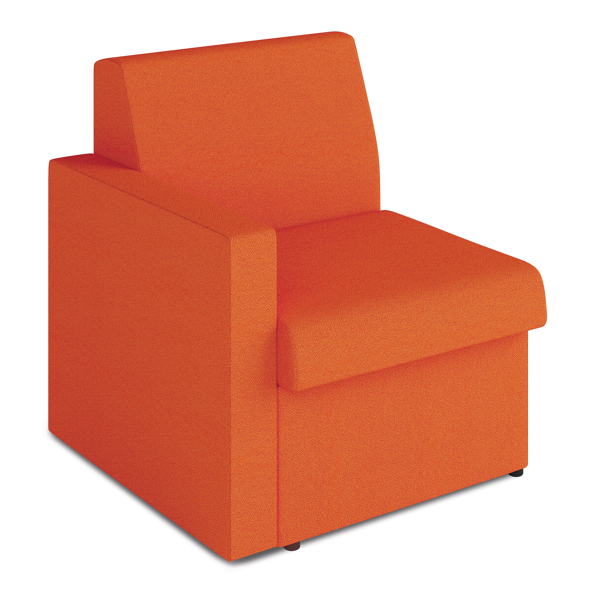 This contemporary rectangular seating end unit with a right hand arm is made-to-order in the U.K and part of a contemporary modular reception collection combining oversized deep cushioned seat and a low and generously padded backrest with curvature for increased comfort and aesthetics. A robust framework is stylishly upholstered and available in all Camira Phoenix and Camira Stripe finishes.