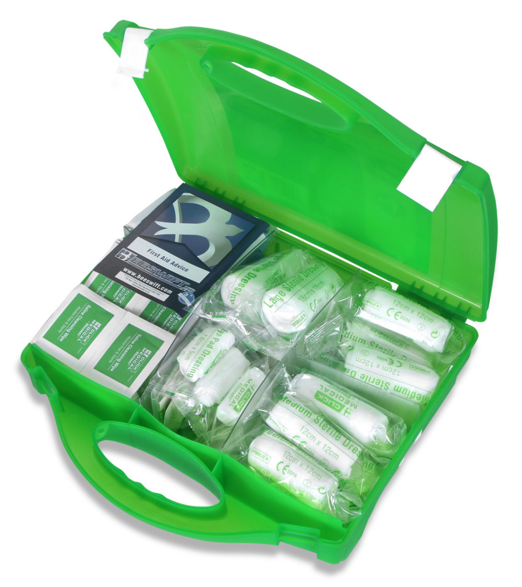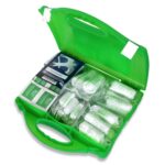 Kit Contains:-, 1 x Guidance note, 8 x Non woven triangular bandages, 4 x Large sterile dressing (180 x 180mm), 12 x Medium sterile dressing (120 x 120mm), 6 x Sterile eye pad dressing, 60 x Assorted sterile waterproof plasters, 20 x Alcohol free cleansing wipes, 3 x Pair of disposable vinyl gloves, 12 x Safety pins