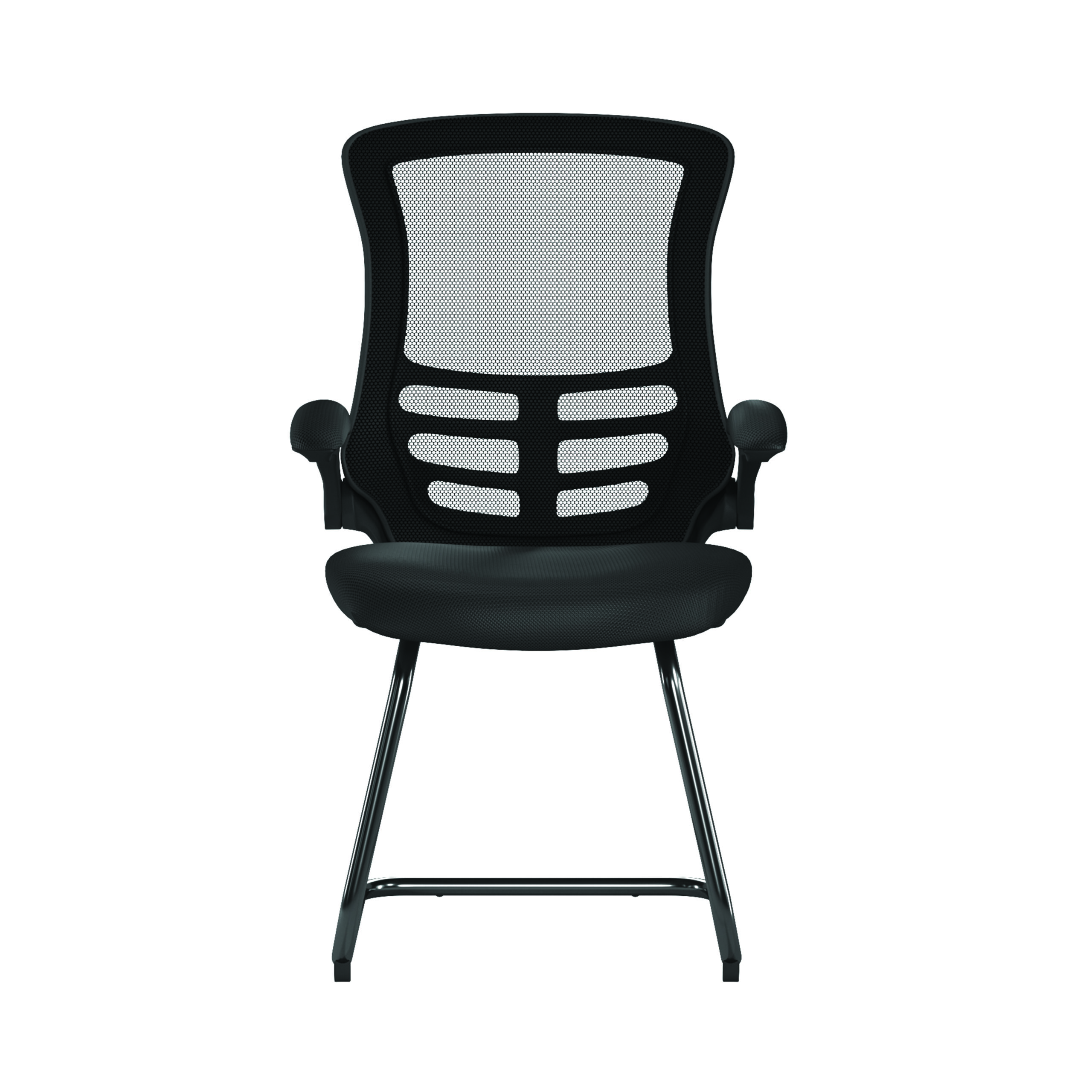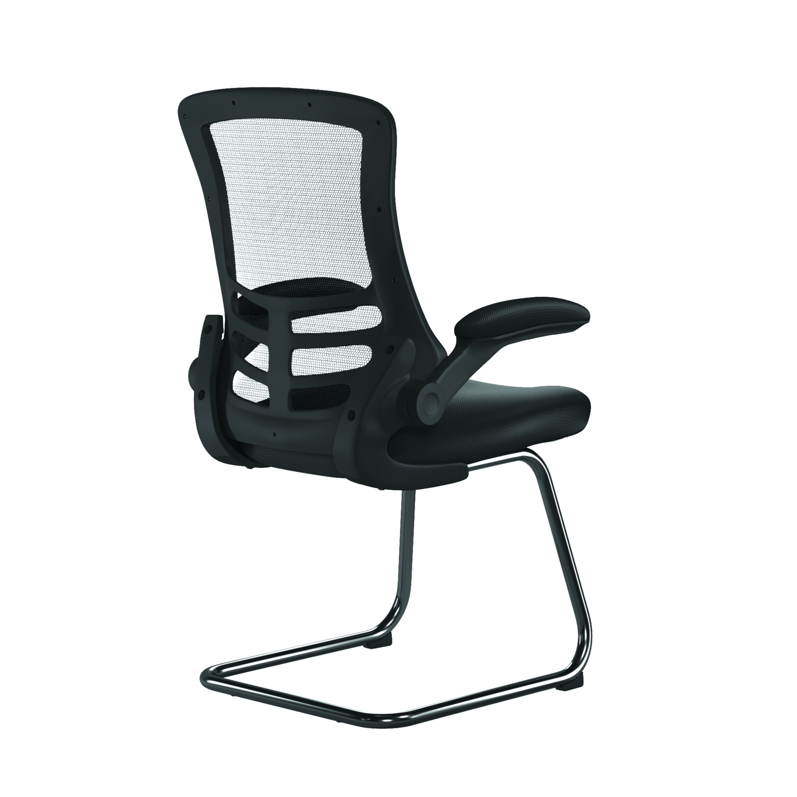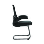 this contemporary designer visitor chair boasts folding arms, an AIRFLOW mesh seat, posture contoured mesh back with stylish black shell and a sturdy 35mm tubular black frame.