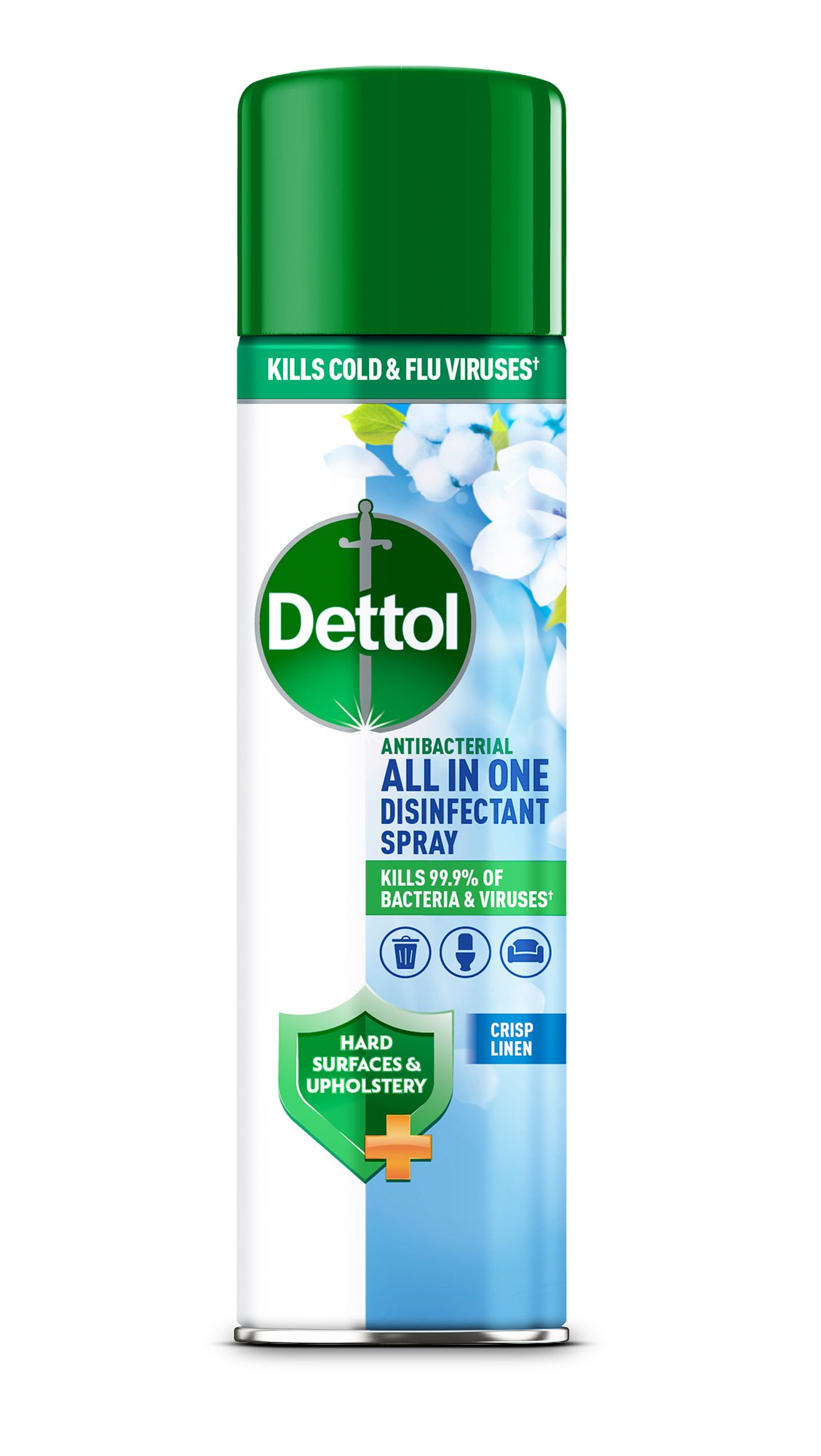 Dettol All-in-One Disinfectant Spray can help prevent the spread of harmful bacteria and viruses. This spray kills 99.9% of bacteria and viruses on both hard and soft surfaces, whilst also fragrancing the air with lasting fragrance.