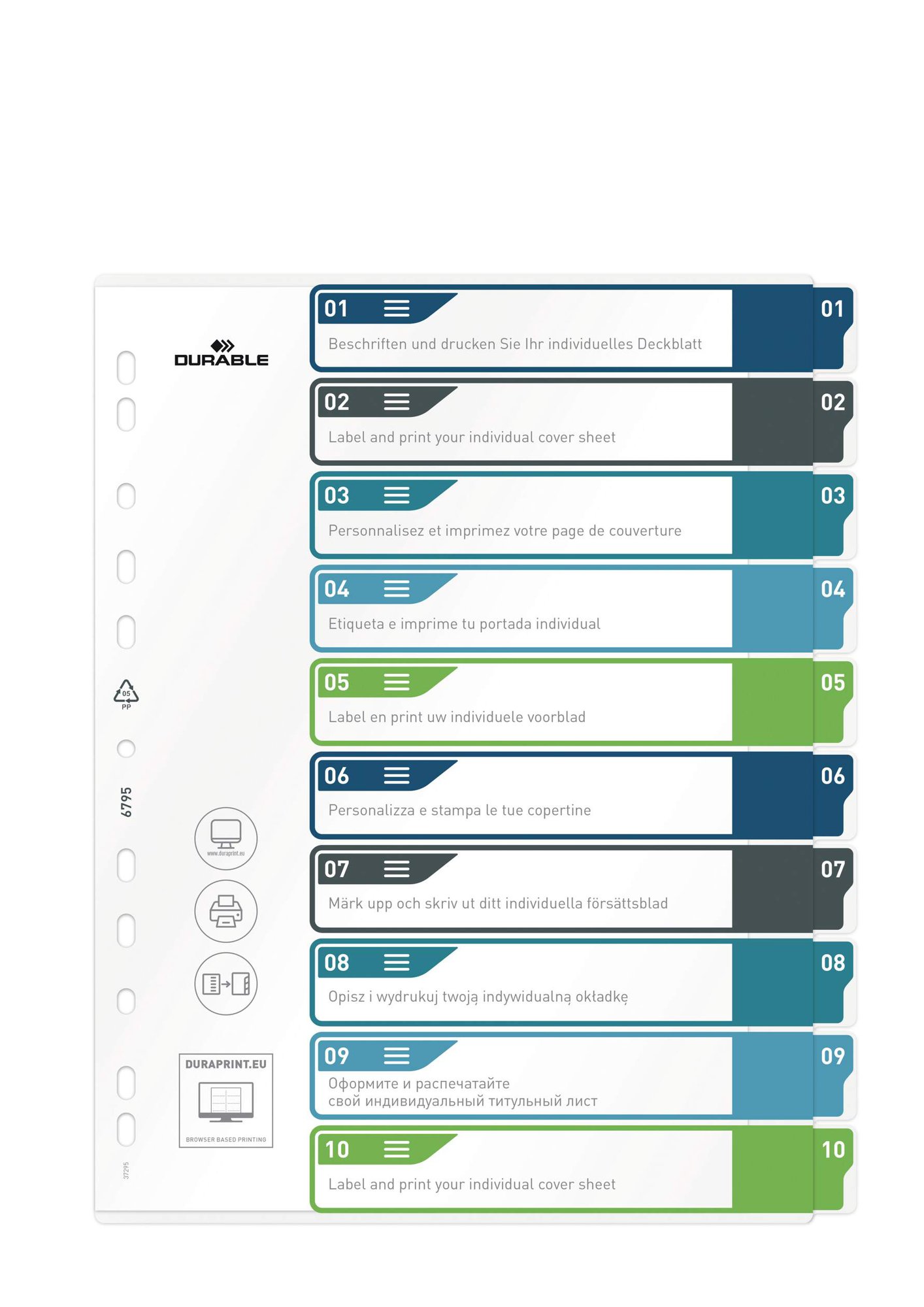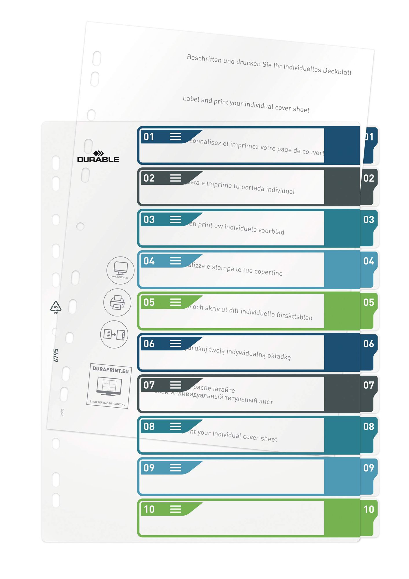 Durable tear-resistant file dividers with 10 numbered tabs for separating your documents numerically. The German designed index dividers use universal punching for maximum compatibility and includes a cover sheet for labelling.