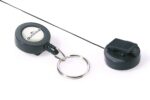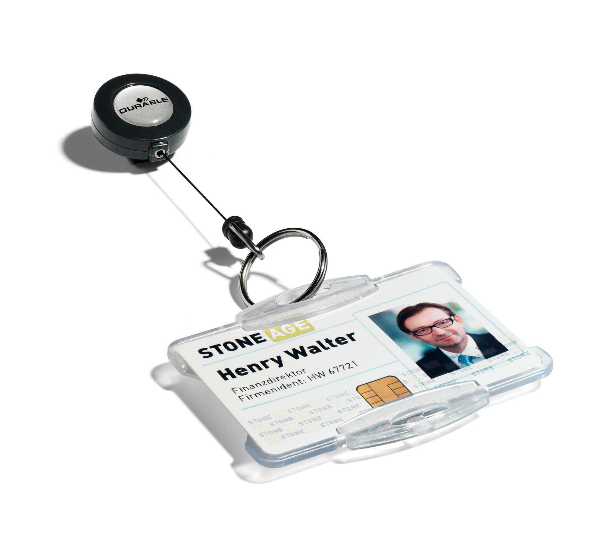 Modern German-designed badge reel with key ring fastener compatible with keychains and punched hole name badges. The reel features a secure clip on the reverse for attaching to pockets or belts. Perfect for workplaces with high levels of security.