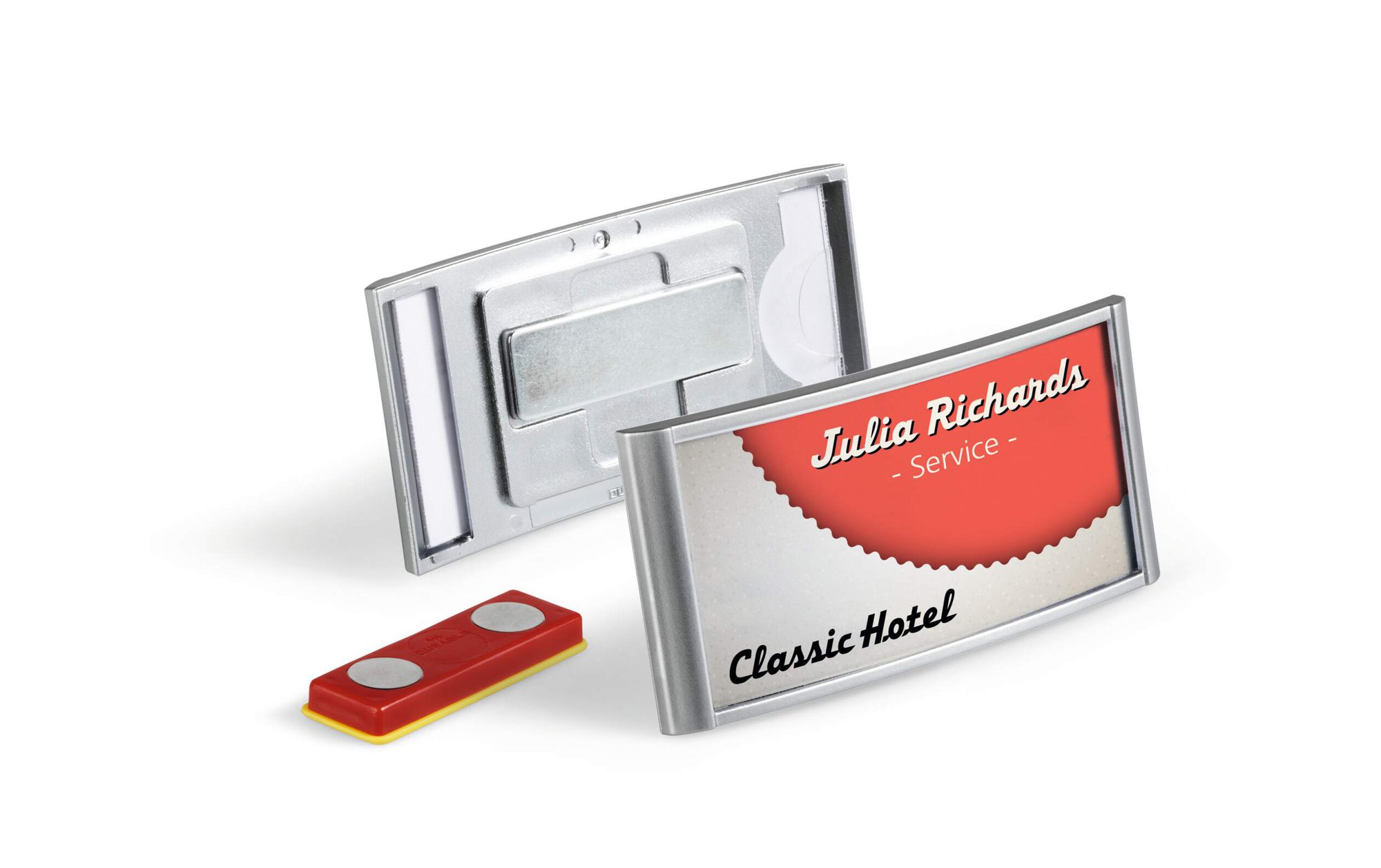 A crystal clear framed name badge with an unpretentious, executive design for use in banks, hotels, hospitality and trade fairs etc. It features a simple and secure magnetic fastening that will not damage clothes, even delicate fabrics.