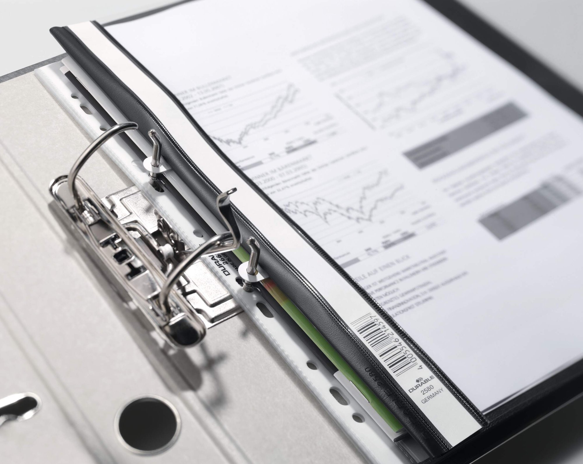 Durables original Clear View folder made from copy safe anti-glare polypropylene. The folder features a transparent front cover, and full length label holder for organisation. The rear cover is recessed for easier page turning and includes a 8cm filing bar for punched paper.