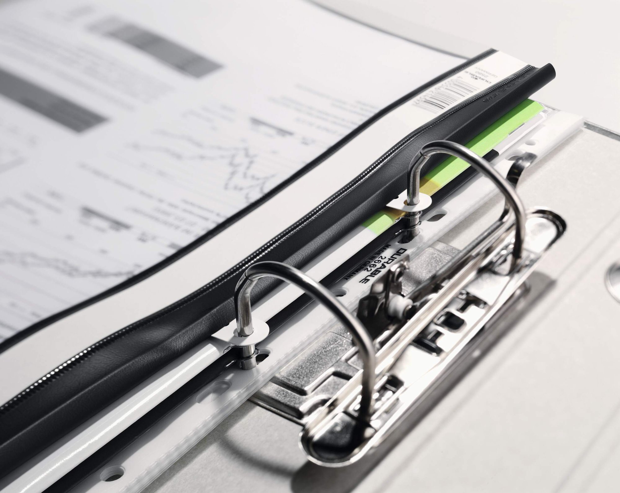 With removable filing strip (punched 8 cm) for filing in lever arch files and ring Binders