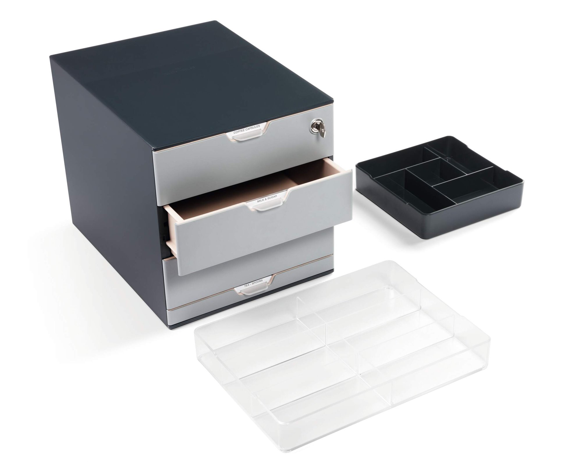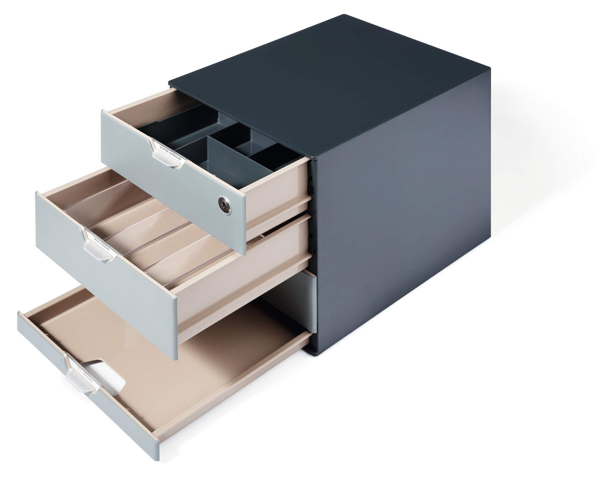 Durable COFFEE POINT boxes offer spacious, flexible and user-friendly storage and organisation. Perfect for common catering and office supplies such as coffee pods, tea bags, sugar sachets and stationary. Ideal for use in meeting rooms, reception and break-out areas with a secure GDPR compliant cylinder lock on the top draw.