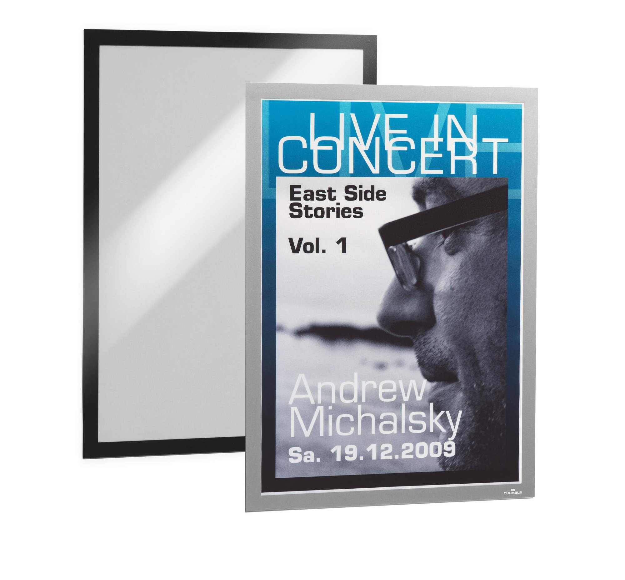 The original fold-back frame. DURAFRAME is the ideal solution for displaying posters and advertising in large formats. The inserts can be quickly exchanged thanks to the unique magnetic fold-back design. When applied to glass, information can be read from both sides and will leave no residue when removed.