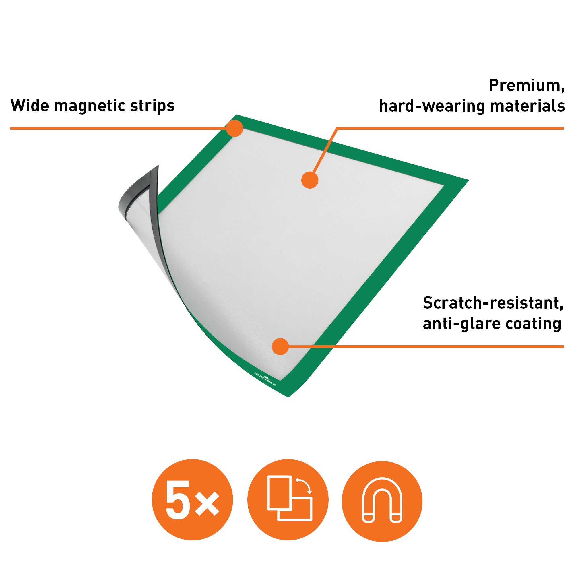 • VERSATILE – Education, Offices or Warehouses – featuring anti-glare, spray & scratch-resistant materials DURAFRAME is the most versatile magnetic frame in the UK