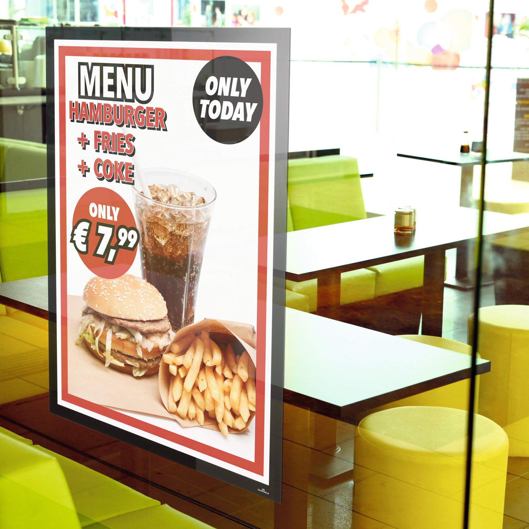 The original fold-back frame. DURAFRAME POSTER is heat stable up to approx. 70 degrees, UV resistant and anti-glare. The frames are double-sided, so when applied to glass, different information can be displayed on either side.