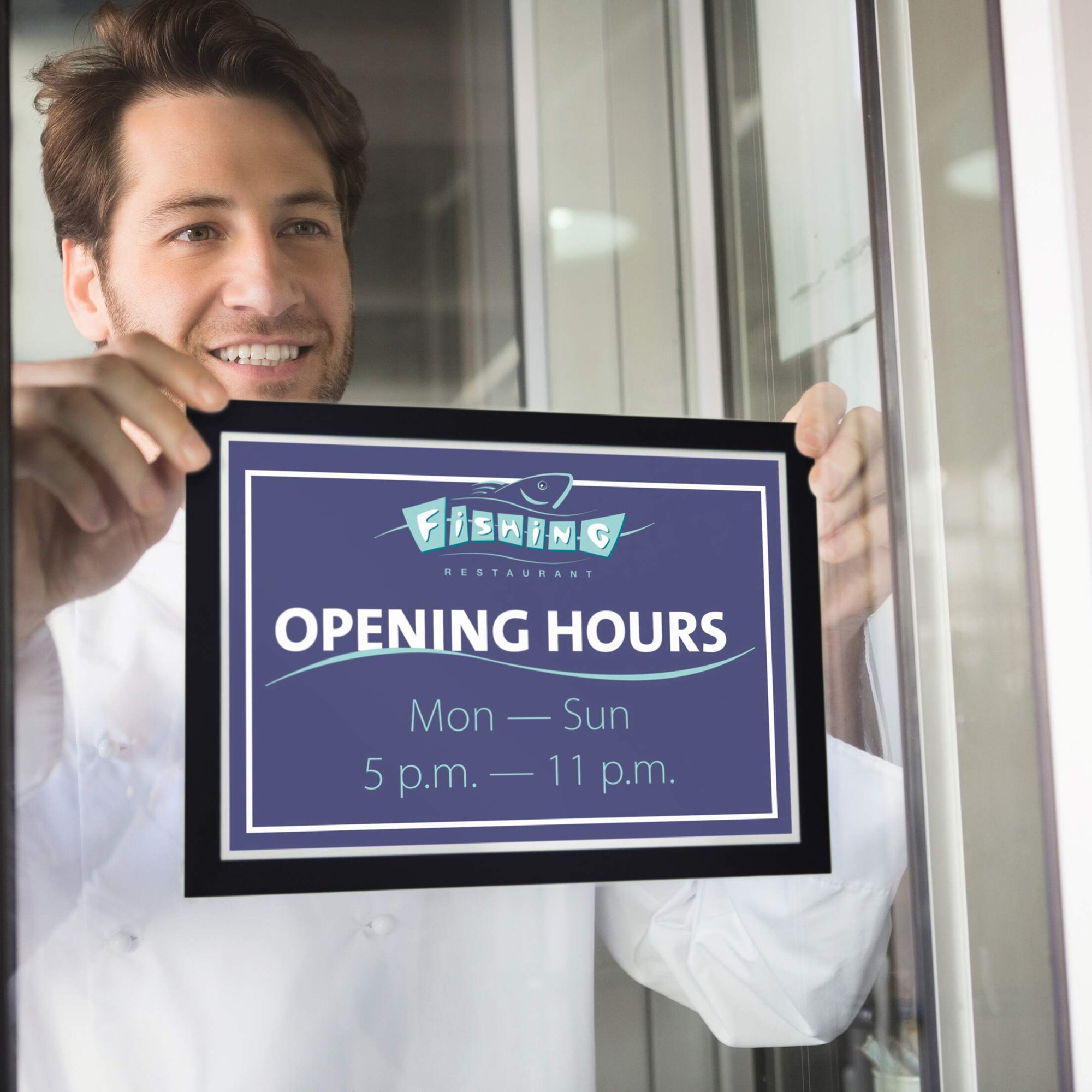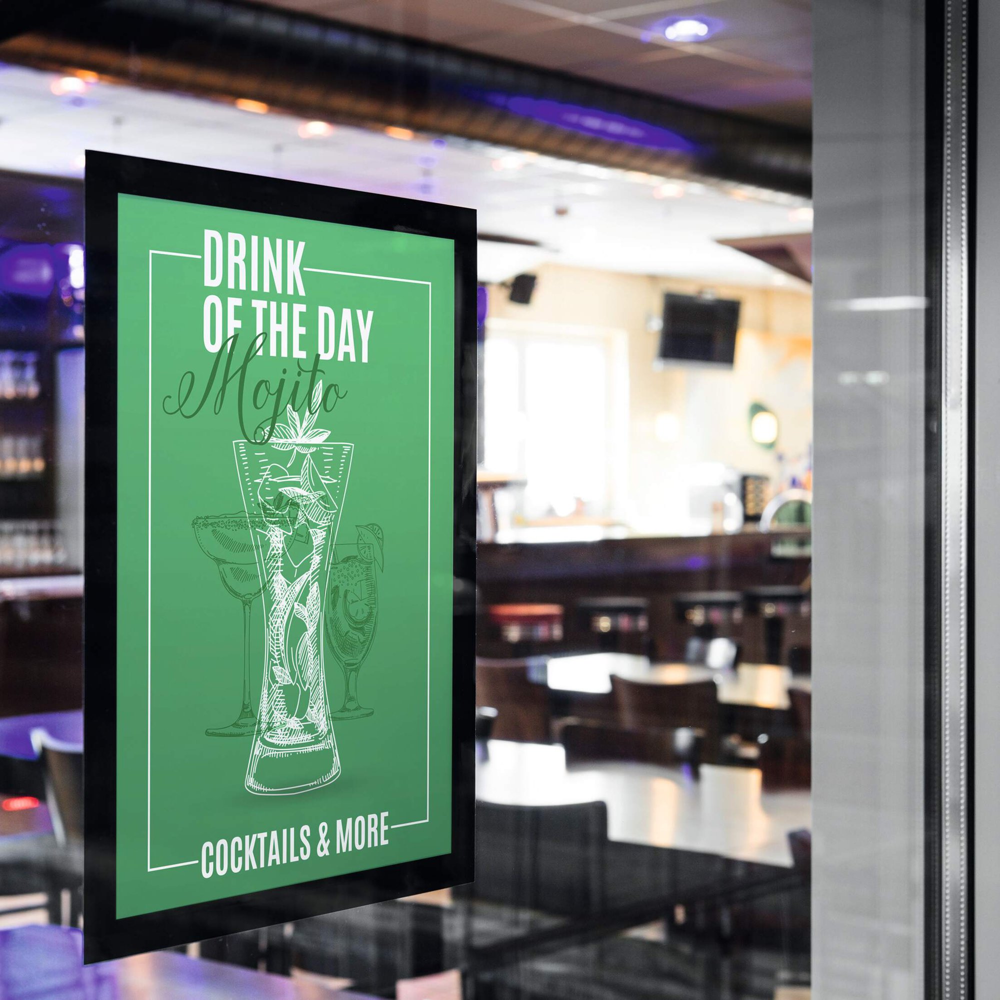The inserts can be quickly exchanged thanks to the magnetic fold-back frame. The frame can also be repositioned time and time again thanks to its static cling attachment. No need for tools or expensive installation fees.