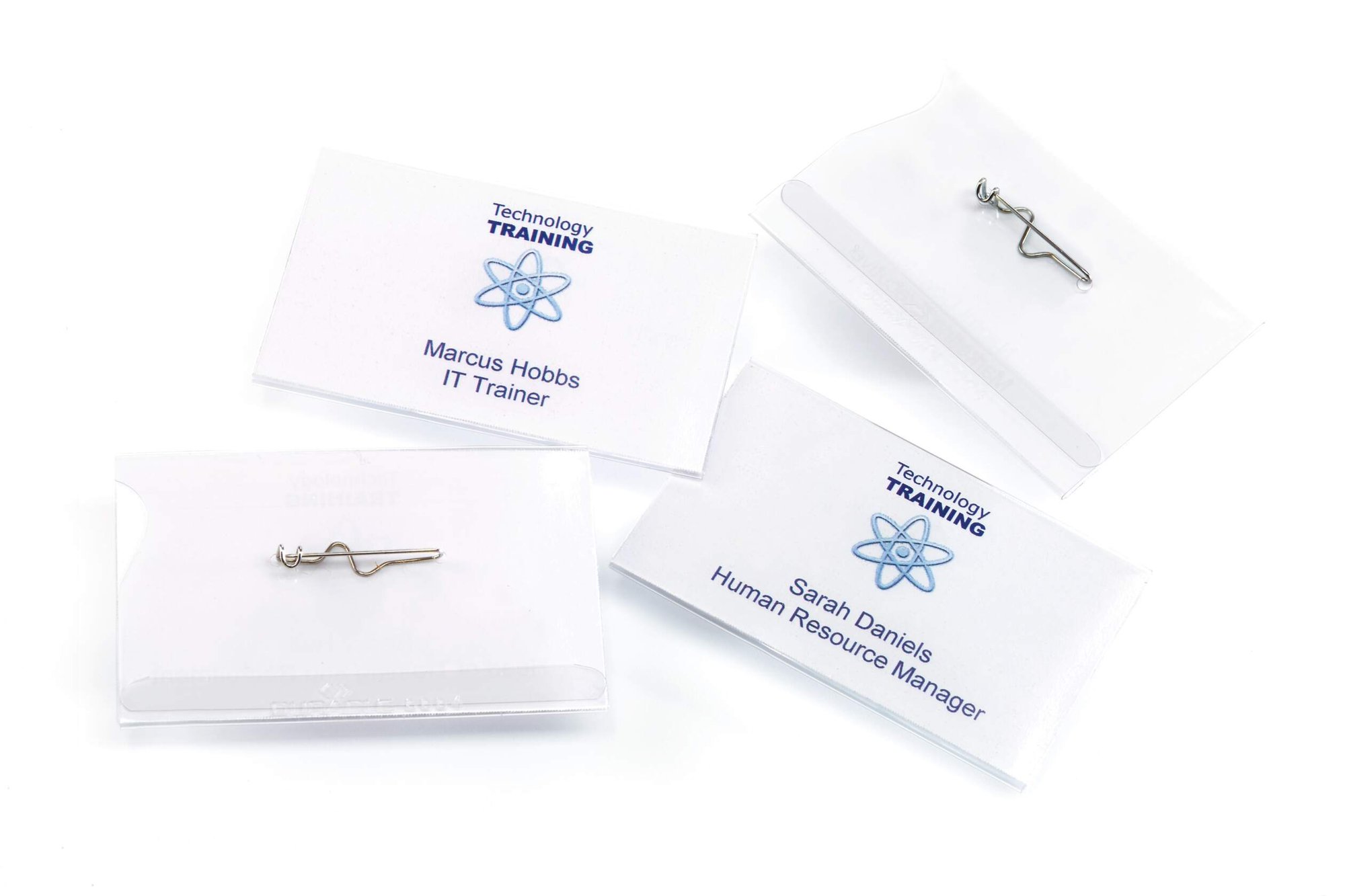 Crystal clear transparent name badges made of premium anti-tear plastics for increased durability. Our name badges feature a curved metal pin with shielded tip to avoid injury and ensure a secure hold on clothing.