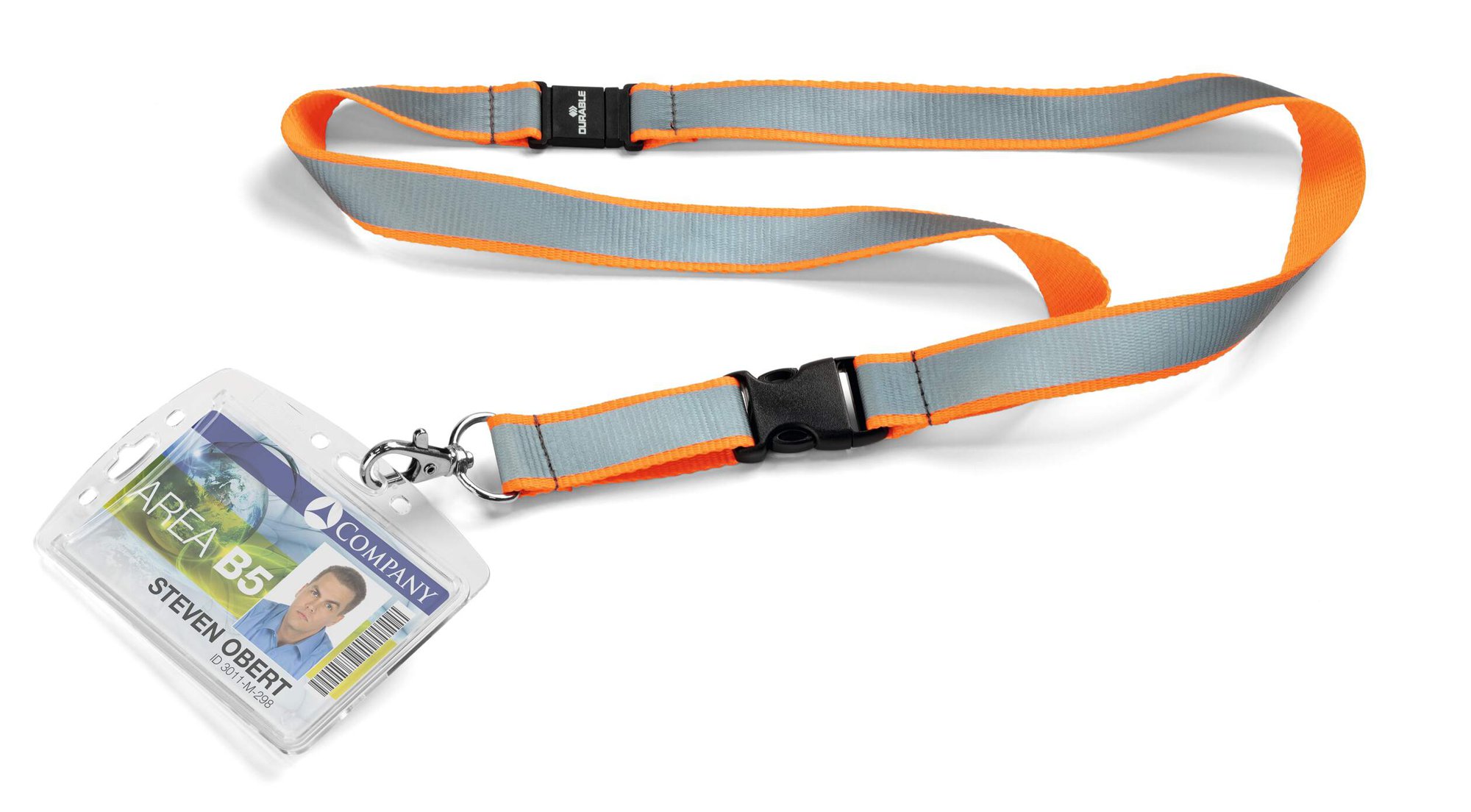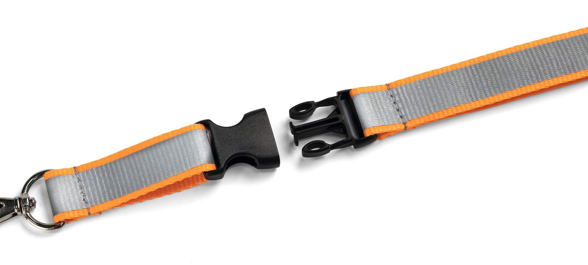 Textile lanyard with a large reflective surface in safety orange for increased visibility in lowlight and hazardous situations. Includes a built-in safety release protecting the user if the strap becomes caught or trapped.