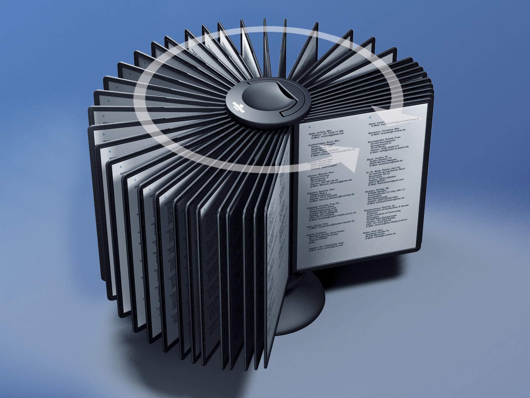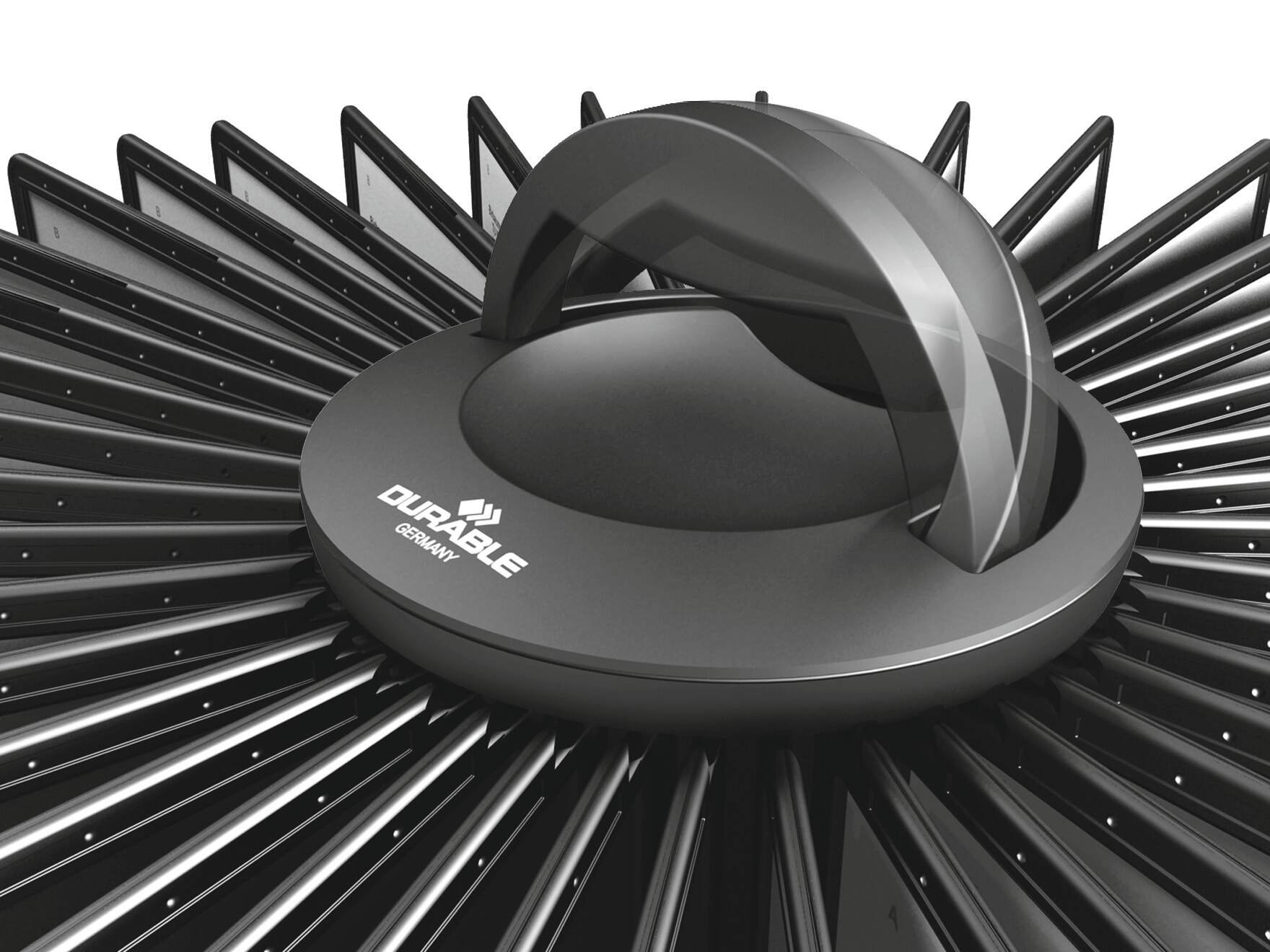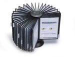 The DURABLE SHERPA Carousel Table 40 is a versatile rotating display system that comes complete with 40 black A4 display panels and 40 index tabs. It features a weighted, non-slip base for stability, and a small handle at the top for easy relocation and smooth rotation of the panels.