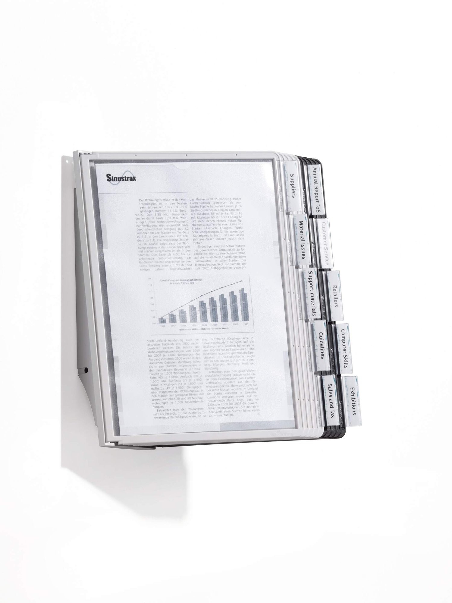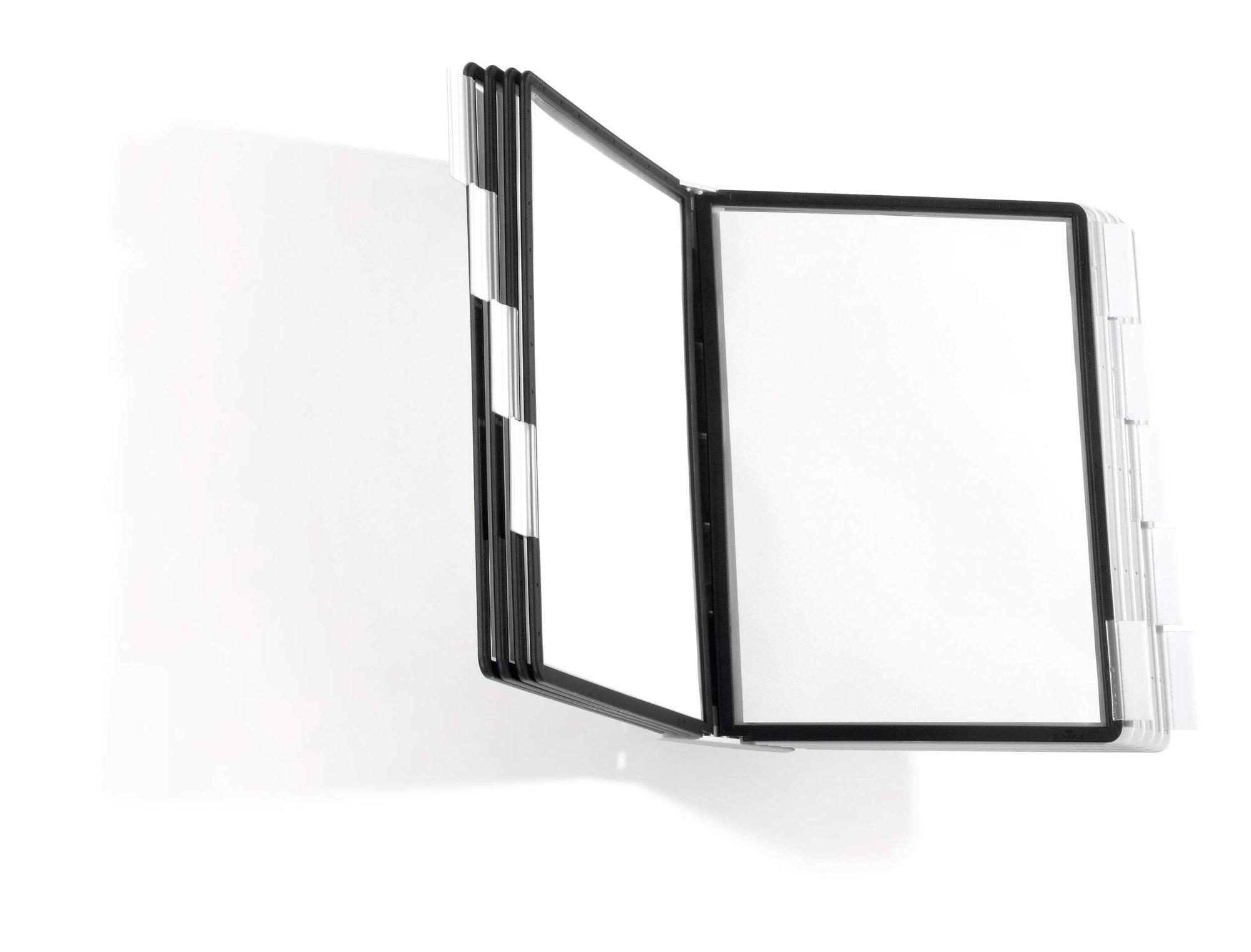 The DURABLE SHERPA® range is a stylish display panel system range with a sturdy base. Perfect for use in a showroom, office, etc. This wall unit includes 10 A4 display panels (5 black and 5 grey) poor holding documents. The panels are anti-glare and copy-proof which makes it easy to use. Great for holding price lists, product information, frequently used telephone numbers, etc.