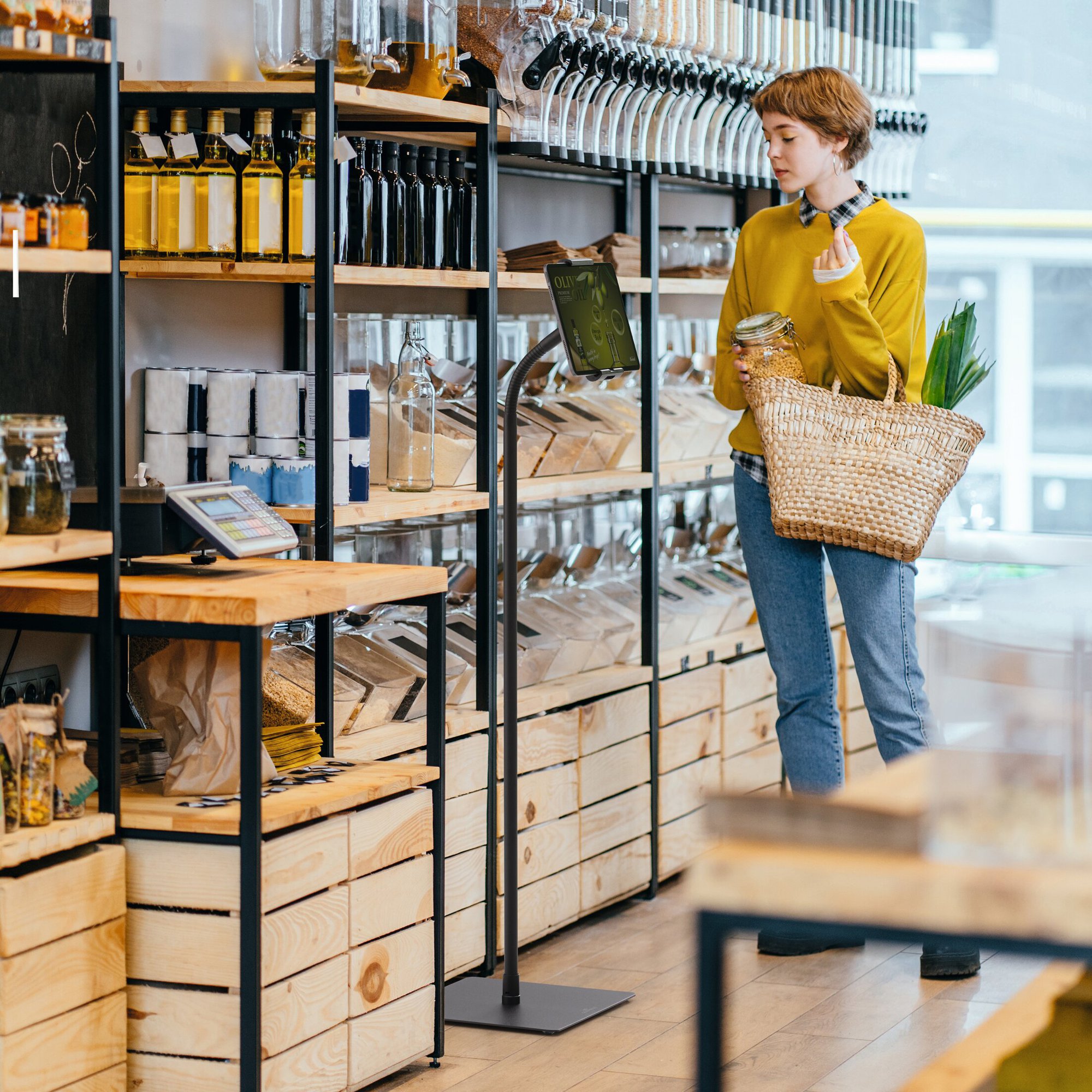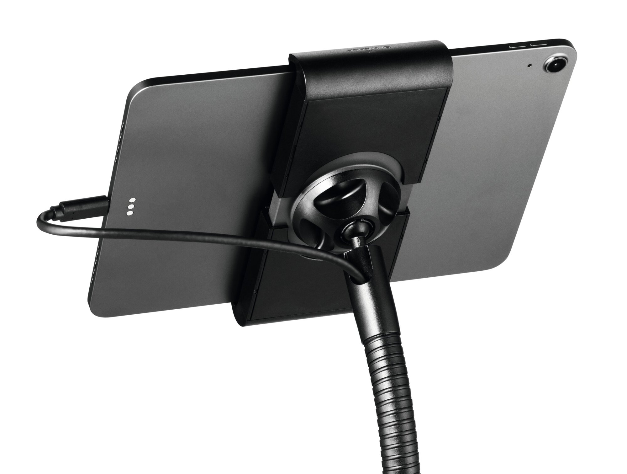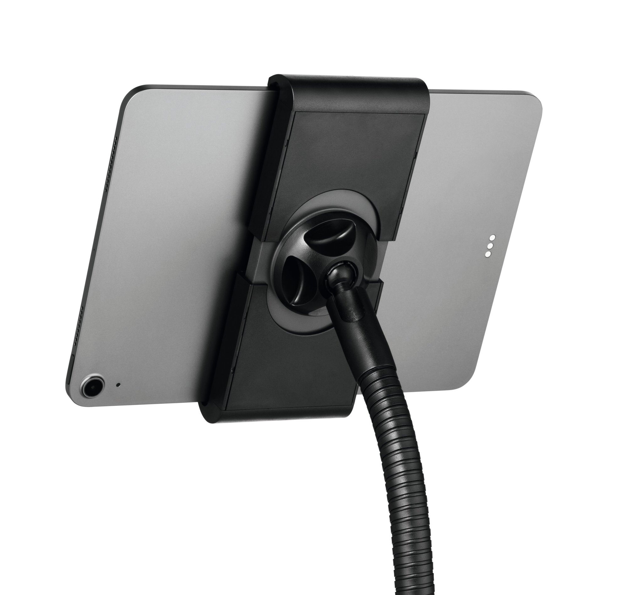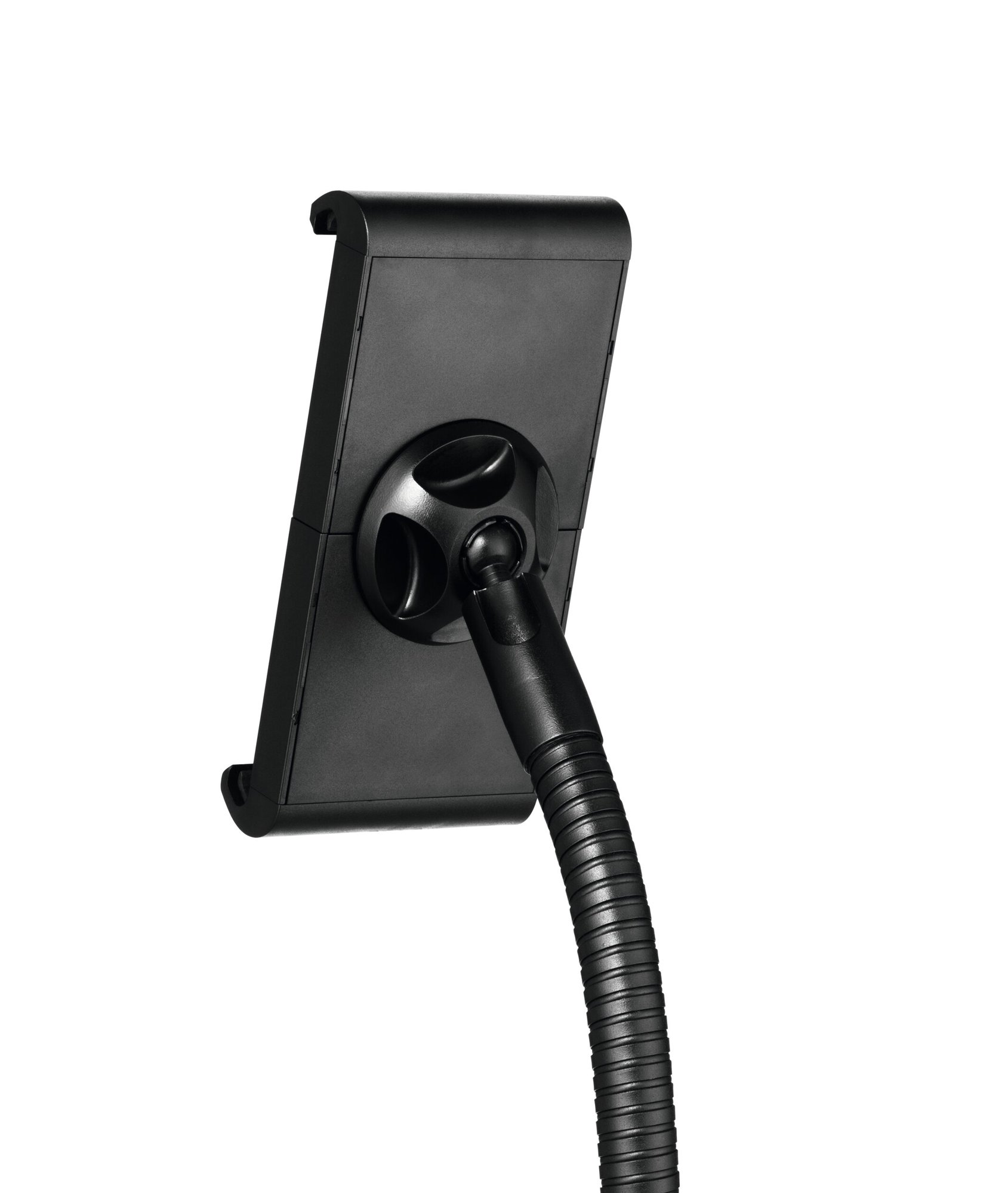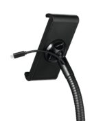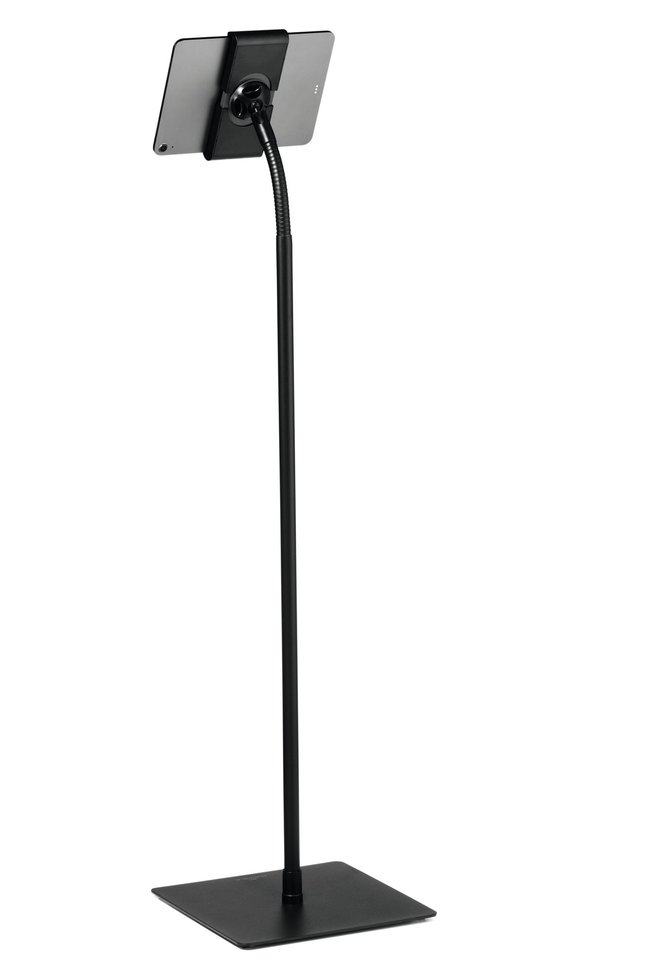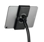 The Durable Tablet Holder TOUGH Floor Stand offers a secure and versatile solution for displaying tablets in public and professional settings. This stand is made from flame-retardant material and features a flexible ball joint and swivel arm for effortless positioning. Its ergonomic gooseneck design allows for infinite height adjustments and 360-degree rotation, ensuring optimal viewing angles.
