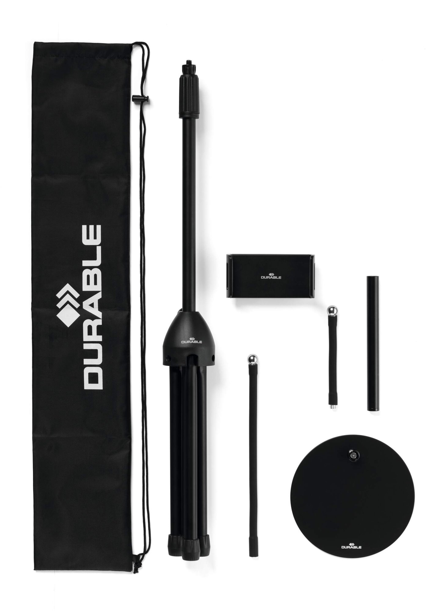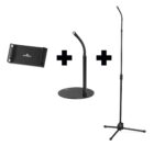 The bundle includes a floor and desk stand with a phone and tablet attachment to quickly and easily transfer your device between them.