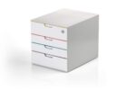 Durableās contemporary VARICOLORĀ® MIX drawer box is made of premium-quality plastics with 4 silent smooth-operating drawers. The box features an integrated GDPR compliant cylinder lock with 2 keys for confidential documents and personal belongings.