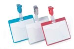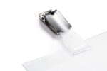 Transparent landscape hard PVC plastic name badges with an open cover for quickly changing inserts. They feature a rotating clip fastener to keep the badge sitting vertically and a clip cut-out for combination with chains, badge reels or lanyards.