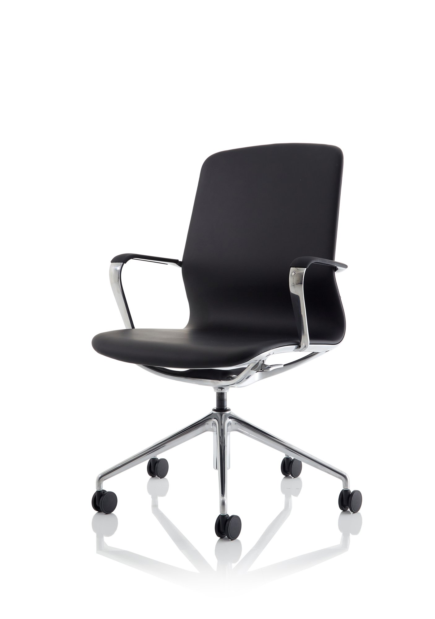 • Elegant Design: The Lucia Medium Back Executive Office Chair features a sophisticated and modern design, with black vegan leather upholstery and a polished aluminum frame, arms, and 5-star base, adding a touch of class to any office environment.