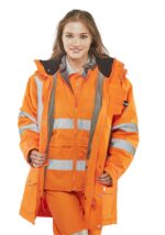 Highly versatile garment, Suitable for ”All Seasons” use, Breathable outer shell, Removable hood, External phone pocket, D rings for attaching identity tags, Fleece lined collar on outer garment, Hook and loop adjustable cuffs, Hand warmer pockets, Inner jacket zipout sleeves, 3M Reflective tape Options :- 1, Outer jacket worn with inner jacket. 2, Outer jacket only. 3, Inner jacket only. 4, Inner jacket only reversed. 5, Outer jacket with bodywarmer (sleeves removed). 6, Bodywamer only. 7, Bodywarmer only reversed. Conforms to EN ISO 20471 Class 3 High Visibility, Conforms to EN343 Class 3 Water Penetration Class 3 Air Permeability, RIS-3279-TOM – Railway use Certified
