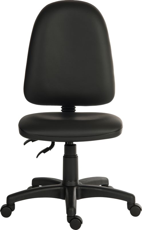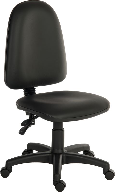 The Teknik Office Ergo Twin PU Black is our contemporary, wipe clean twin lever high back operator chair. It has a floating or fixed permanent contact backrest, gas lift seat height adjustment and a sturdy nylon base. It also benefits from a 150kg rated gas lift. This accepts optional arms rests in fixed or height adjustable form and is also available in Blue or Black Fabric.