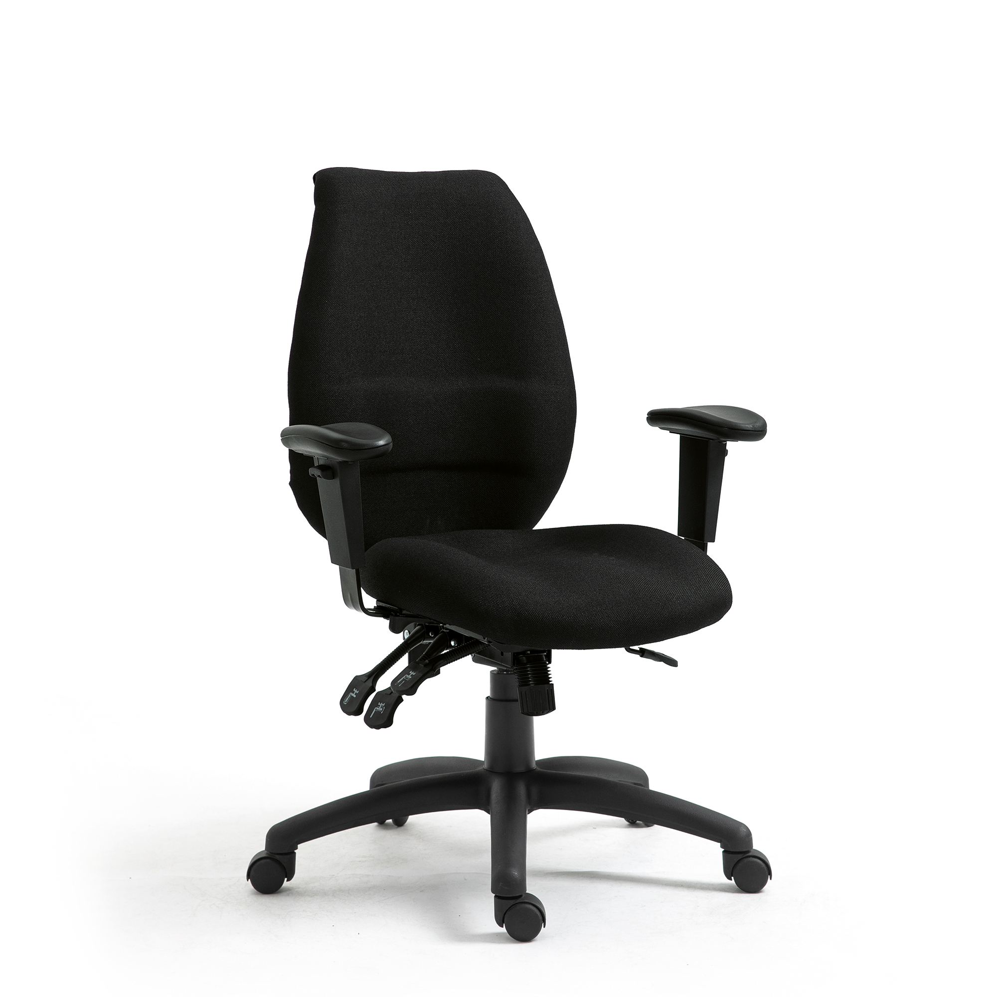 Modest, sturdy and reliable, this ergonomic 24 hour high back chair is host to a range of features which allow adjustment to suit the user’s preference. A contoured backrest with a 3D curvature incorporates lumbar and spine support. A multi-set synchronous mechanism offers back height, back rake, forward seat tilt and seat slide adjustment. It also provides tension control adjustment to allow for the individual’s bodyweight and is lockable in the upright position. A sturdy gaslift offers easy seat height adjustment and multi-directional, height adjustable arms as well as a large black nylon base fitted with twin wheel castors complete this impressive offering.