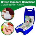 Contains a British Standard catering first aid kit – this kit contains all the supplies needed to provide general first aid in food preparation areas, including items such as blue plasters.
