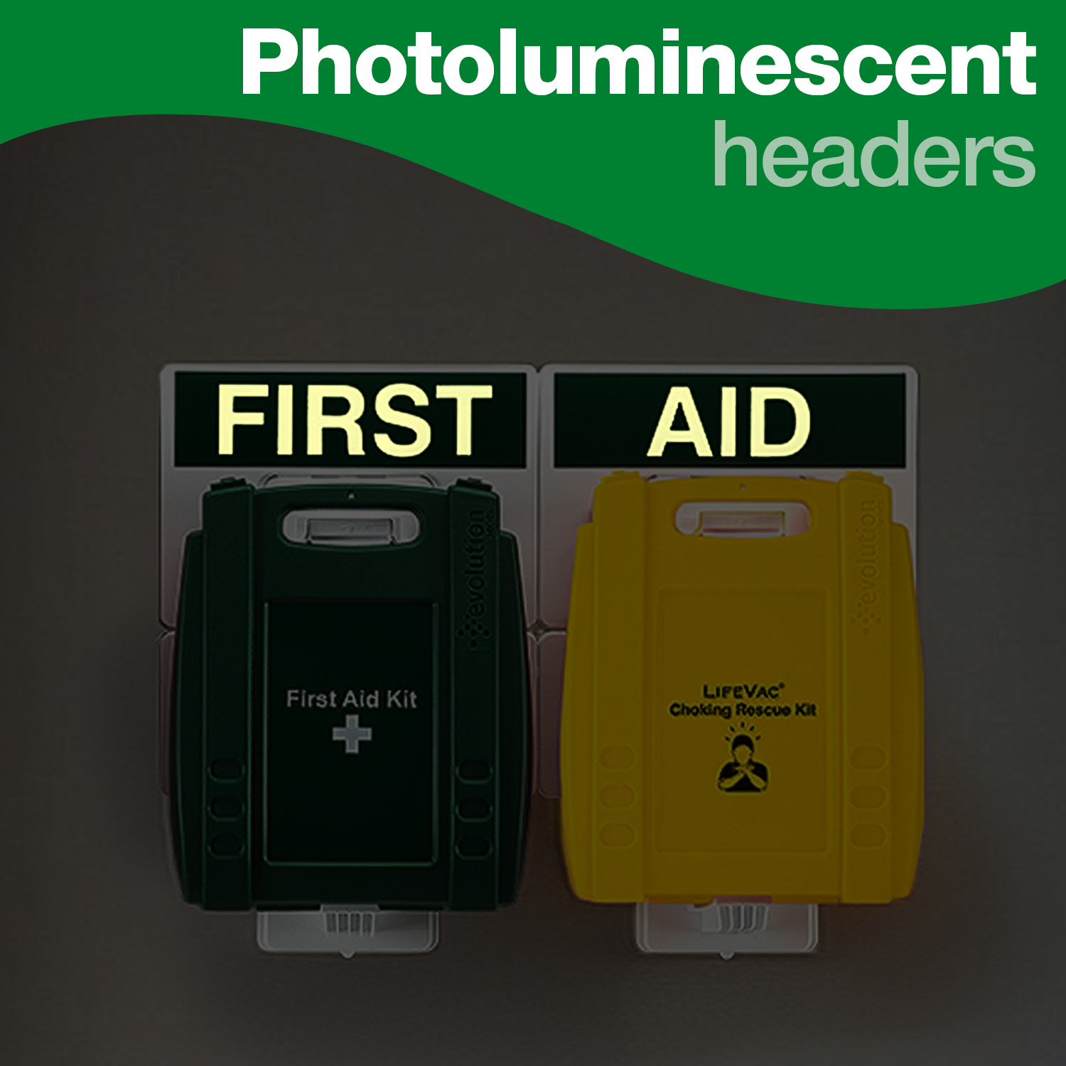 Photoluminescent headers – ensure your first aid point is always visible even in situations where there is smoke or minimal lighting with these photoluminescent headers.