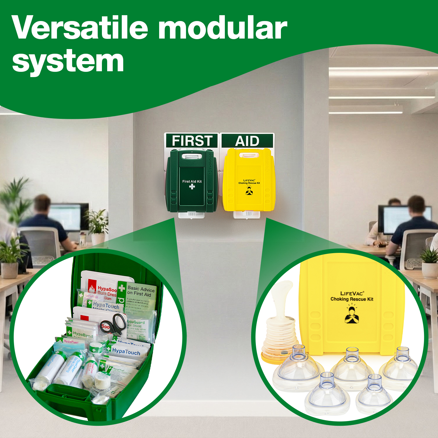 Each Evolution has a bold colour matching its use, in this instance green is for general first aid and yellow is for the LifeVac kit. As well as clear labelling with both a symbol and words to ensure easy identification.
