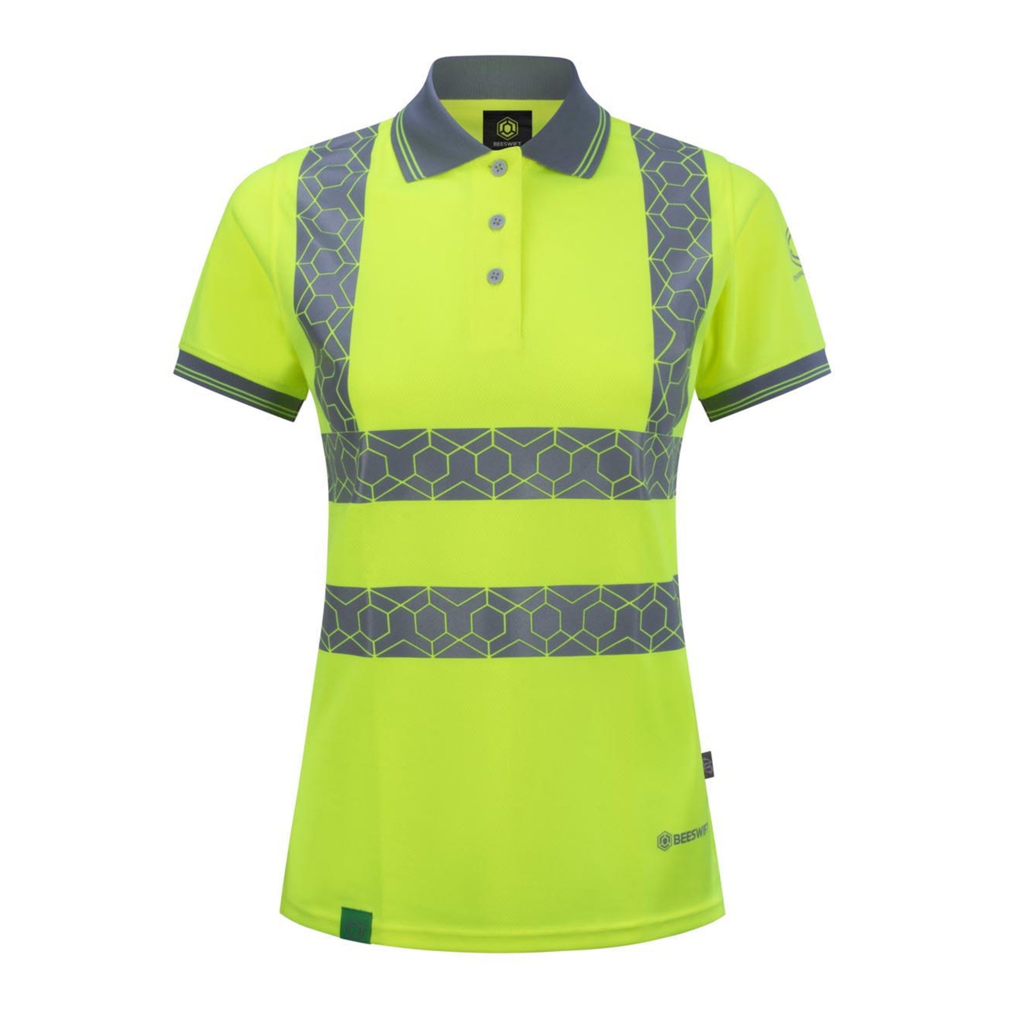 100% Recycled polyester ”Bird Eye” fabric. 160gsm fabric weight 3 Button placket. Grey trim to collar and cuffs. Hex patterned heatseal Retro-Reflective tape for comfort and flexability. UV Protective SPF40, ”EN 13758-1 – Part 1: Method of test for apparel fabrics. ” Global Recycled Standard Certificated Tested to 50 washes Conforms to EN ISO 13688:2013+A1:2021 Conforms to EN ISO 20471:2013 +A1:2018 Class 2 high visibility (sizes S+ (08+)) Class 1 high visibility (size XS (06))