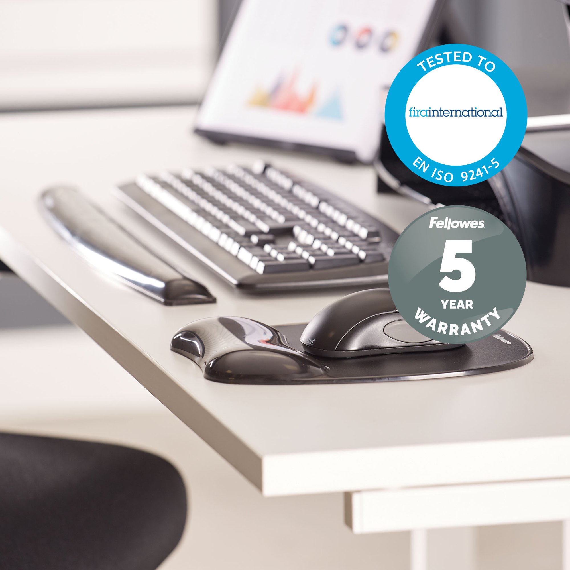 This self adjusting gel wrist rest allows personalised comfort as the keyboard support has the ability to conform to your wrist, which helps relieve pressure and fatigue whilst typing. With the easy clean surface, the innovative design allows you to wipe the keyboard wrist rest clean with a damp cloth, making it perfect for all environments. Typing on a keyboard or using your mouse for hours at a time, can cause pain and discomfort to your wrists which is why a wrist support is necessary for a healthier workspace. To prevent frustration in the workplace or at home, we have incorporated a non-skid rubber backing to the keyboard wrist support which keeps it in place and prevents it from slipping around. Fellowes understand that bad working habits cause many of us physical health problems and fatigue. By using this knowledge we have created a comprehensive range of ergonomic solutions like this innovatively designed products that help you enjoy a more comfortable and productive workspace.