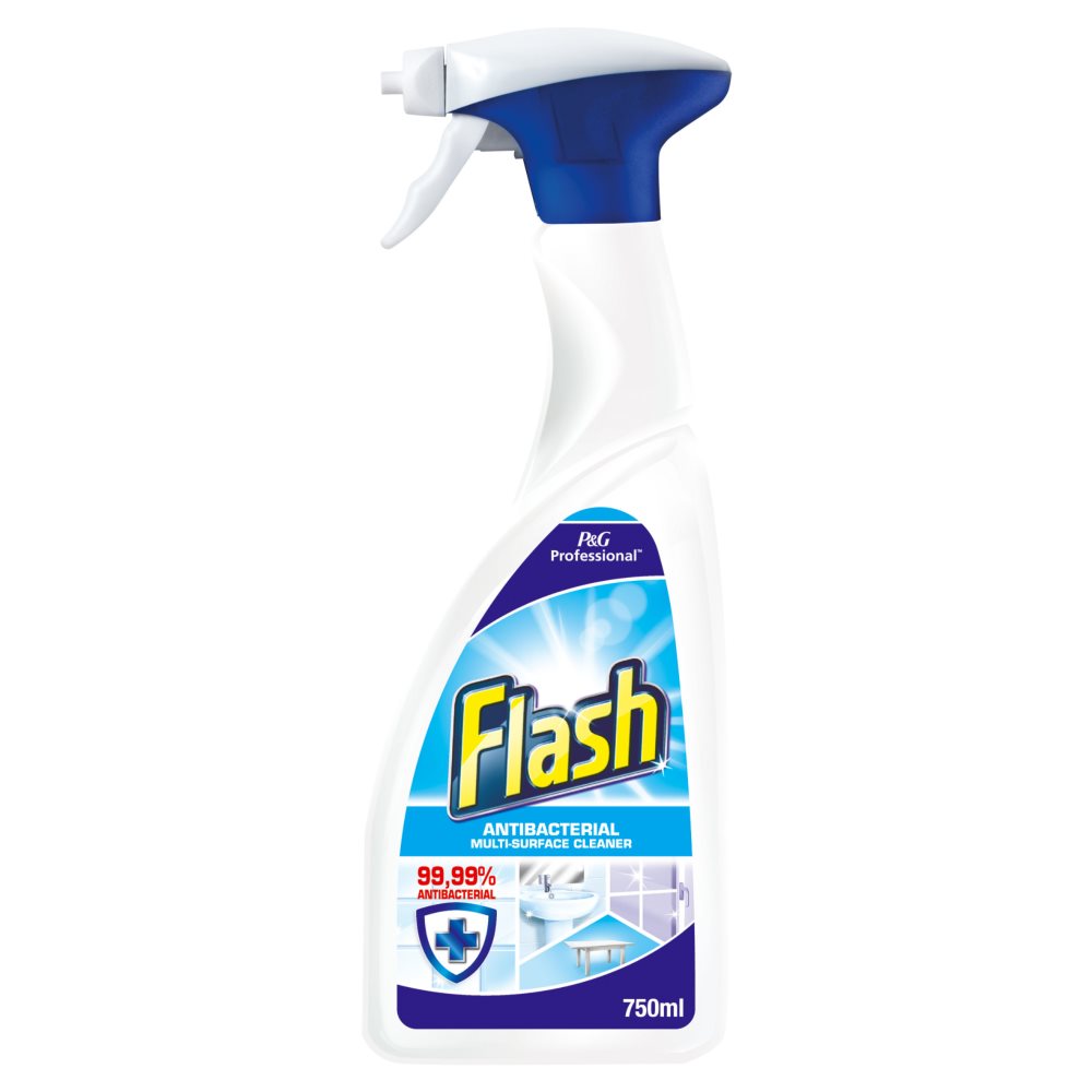 Flash Professional Disinfecting Multi-Surface Cleaner is a ready-to-use spray for cleaning and disinfection of general surfaces, stainless steel and glass. Kills 99.99% of coronaviruses and bacteria in 15 seconds according to EN14476 and EN1276. This includes bacteria on EN1276/EN13697 (15sec/5min contact time, clean/dirty conditions), and viruses tested on enveloped viruses EN14476 (15sec contact time, clean conditions). Not tested on SARS-CoV-2.