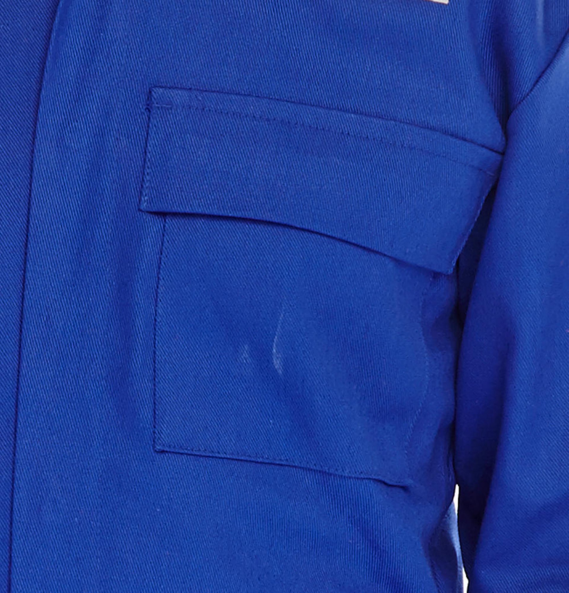 300 gram 100% cotton drill fabric with flame retardant treatment, FR reflective tape. (Nordic Pattern), Concealed stud front to neck, One left breast pocket with flap, Two front hip pockets, Knee pad pockets, Plain back and hips EN ISO 11611: 2007 Class 1 A1 – Protective clothing for use in welding EN ISO 11612: 2008 A1, B1, C1 – Protection against heat and flame, Does NOT conform to EN ISO 20471